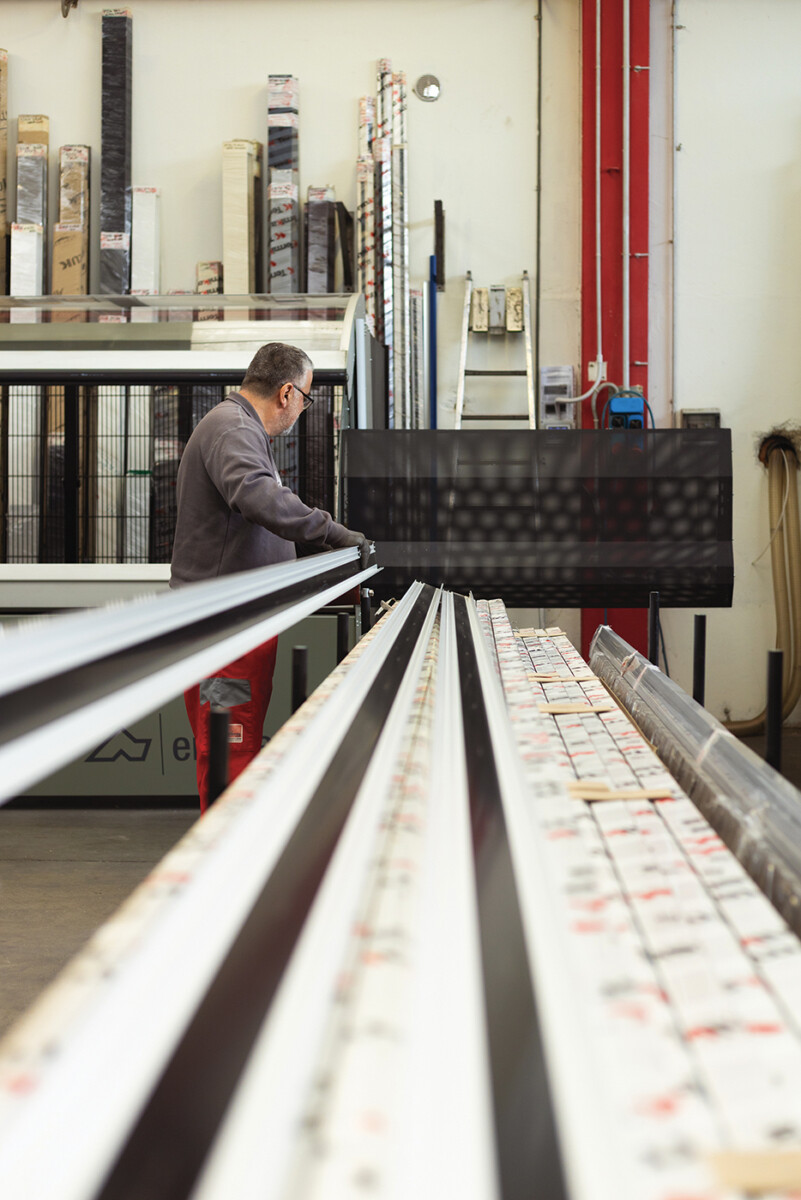 Con l’introduzione dei nuovi impianti interconnessi, il processo produttivo è stato completamente ripensato. Oggi è l’ufficio tecnico a programmare e lanciare le lavorazioni direttamente in macchina, garantendo una preparazione più accurata già in fase progettuale. Ogni pezzo può essere visionato in 3D, analizzandone a monte profili, rigidità ed eventuali criticità. Una seconda macchina invece permette tagli e rifiniture accurate al decimo di millimetro, per un prodotto performante ma soprattutto personalizzabile in toto in base alle esigenze del cliente. Il tutto nel pieno rispetto degli standard internazionali di gestione della qualità previsti dalla certificazione internazionale ISO 9001, a cui Adria Montaggi aderisce.