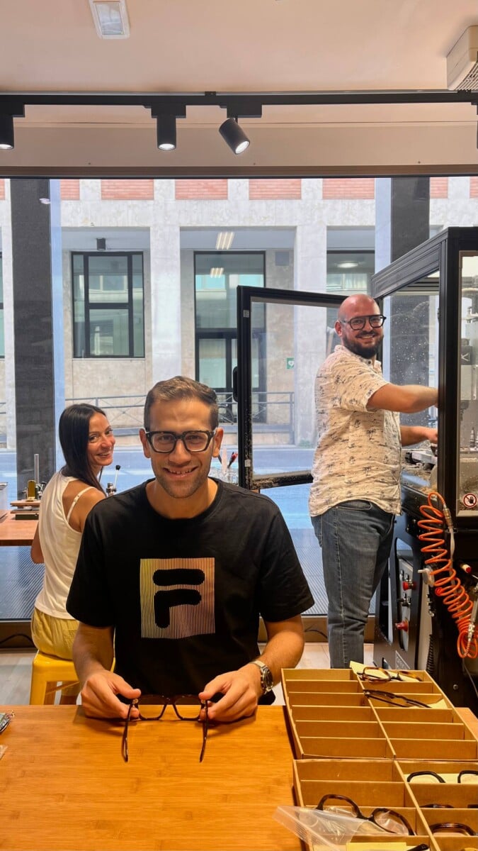«Abbiamo un campionario di montature create da noi, che adattiamo ai volti dei clienti, ma c’è anche chi entra in negozio con un suo disegno che possiamo sviluppare e realizzare da zero» racconta il titolare Marco Di Cesare. L’idea nasce dall’incontro tra la sua storia e lo sguardo innovativo della sua giovane età: figlio di ottici e ottico a sua volta, sente di voler sperimentare «qualcosa di nuovo, diverso e artigianale». Così nel 2015, a soli 24 anni, apre la prima sede di Ottica Di Cesare, in via Alcide De Gasperi 1/3 in centro a Ravenna. Nel 2021 inaugura poi il laboratorio interno dedicato alle montature, diventando una vera e propria occhialeria artigiana. «Un artigianato 2.0 – spiega Marco –, un mestiere antico che si rinnova grazie all’utilizzo di frese e macchinari di ultima generazione, in grado di offrire tagli precisi e finiture realizzate a mano nel solco della tradizione del grande artigianato italiano».