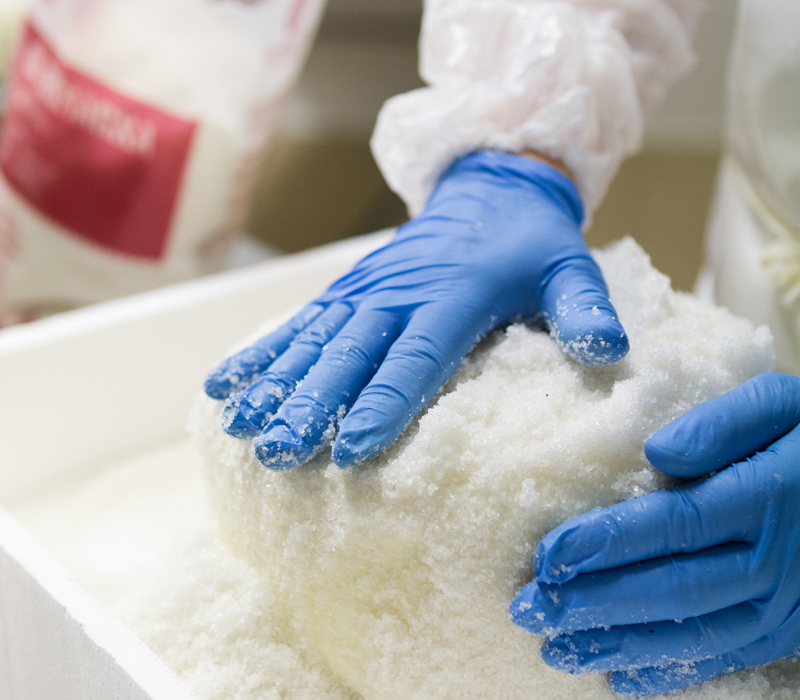 Per i formaggi stagionati, infatti, oltre a latte e caglio, la Centrale del Latte ha optato per l’uso esclusivo del sale “dolce” di Cervia: è un sale marino integrale, non essiccato forzatamente, costituito da cloruro di sodio purissimo, ricco di oligoelementi preziosi per la salute e privo di cloruri amari (è questo il motivo per cui viene definito dolce!). La fase della salatura, procedimento manuale che oltre a dare sapore previene il deterioramento delle forme e prepara alla fase della maturazione, vede quindi l’impiego di questo nostro prodotto locale.
