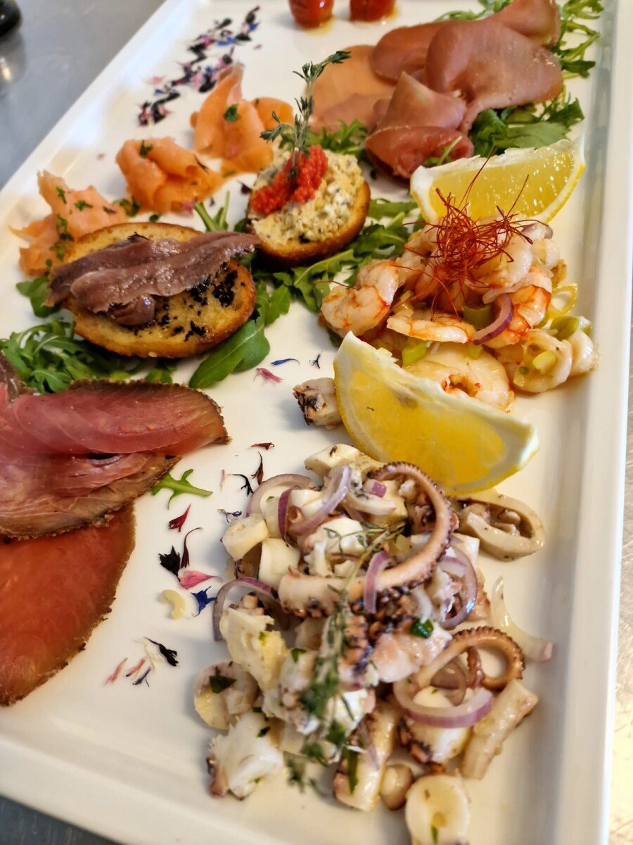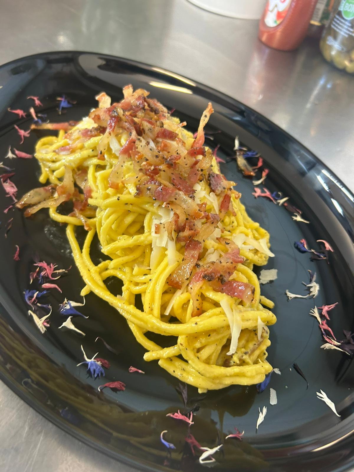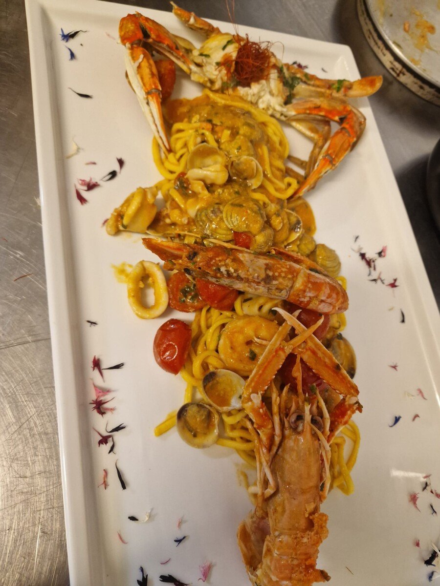 La proposta gastronomica è fortemente orientata al pesce, con una ricca selezione di antipasti freddi, polpo, salumi di mare, risotti e spaghetti alla chitarra con astice, vongole o frutti di mare, oltre a fritti misti e secondi di mare. Non manca una sezione dedicata alla cucina di terra, con taglieri di salumi, tagliatelle e cappelletti al ragù, fino alle quattro varianti della celebre carbonara, reinterpretata con creatività: oltre alla classica, sono disponibili la versione di mare, quella vegetariana e un originale risotto alla carbonara, con uovo grattugiato.