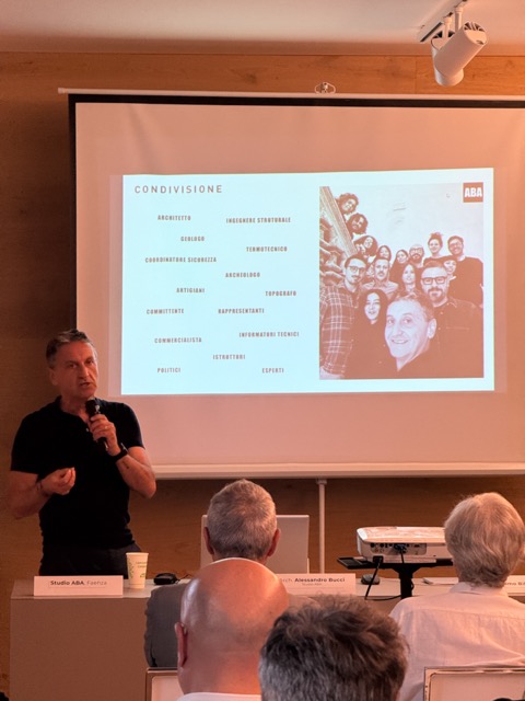 Al termine della visita, dopo un breve coffe break nella cornice dello Showroom di via del Lavoro 4, il professor Guglielmo Bilancioni ha avuto modo di riflettere sul tema de “Il Nuovo Brutalismo. Etica o estetica?”, presentato dal docente Alberto Giorgio Cassani. Bilancioni (già insegnante di storia dell’architettura dell’Università di Genova e grande esperto di Reyner Banham) ha raccontato questa controversa corrente artistica e architettonica partendo proprio dalle riflessioni di Banham, con un focus principale sulla materia prima: «Si tratti di cemento, metallo o mattone – viene sempre e comunque trattata con la massima sincerità e onestà, e presentata nella sua purezza». Dalle riflessioni del professore emerge come l’aspetto materico sia uno dei tratti distintivi di un movimento nato dalla crisi dell’architettura moderna degli anni ’50, come un fondamentale messaggio etico, piuttosto che estetico. La parola poi è passata poi all’architetto Alessandro Bucci, dell’omonimo, storico, studio faentino, che ha illustrato le difficoltà e le sfide quotidiane di chi si ritrova a fare quello da lui definito «il lavoro più bello del mondo» (l’architetto, appunto), alle prese con i concetti di condivisione (di idee, di progetti, di ruoli in una lavorazione), pazienza (nei confronti dei lunghi tempi della burocrazia e di alcuni committenti), rispetto e fiducia (sempre nei confronti del committente ma anche della professione, sia nel suo aspetto pratico che artistico), piacere, memoria (il rispetto della tradizione nel restauro, pur creando una nuova identità), delusione, per tutti quei progetti mai realizzati. Ad ogni parola è stato abbinato uno dei lavori principali dello studio faentino, tra cui il Mercato Ittico di Rimini, la Pista di Motocross di Faenza, e alcune opere commissionate da privati. A chiudere il cerchio sono stati i concetti di “Tempo e durabilità”, perché una casa è fatta per durare. «Concetto su cui non potremmo essere più d’accordo – chiosa Ballardini –. Crediamo che la durabilità debba interessare l’involucro di una casa ma anche il suo interno, per essere in grado di conservare il suo valore e trascendere le generazioni».