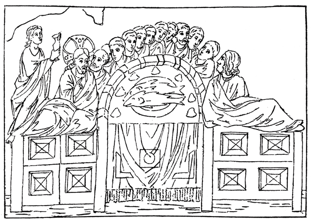 Sulla mensa sono sette pani e due grossi pesci a richiamare il miracolo della moltiplicazione dei pani e dei pesci. Stranamente, un disegno di Felice Kibel presenta alle spalle di Cristo un servo che porge una brocca. Il Ricci, sostenendo l’infondatezza di questa figura, tenta di dare una risposta a questo bozzetto: «Può pensarsi che, precipitato in antico quell’angolo estremo di mosaico, come infatti mostra la tarda ripresa, il vano fosse tardi riempito d’intonaco e dipinto, se pure, essendoci la lacuna, non fu idea e proposta dello stesso Kibel quella di riempirla con tale figura e la indicò in quei disegni. Certo non se ne ha altra notizia né storica, né grafica».
