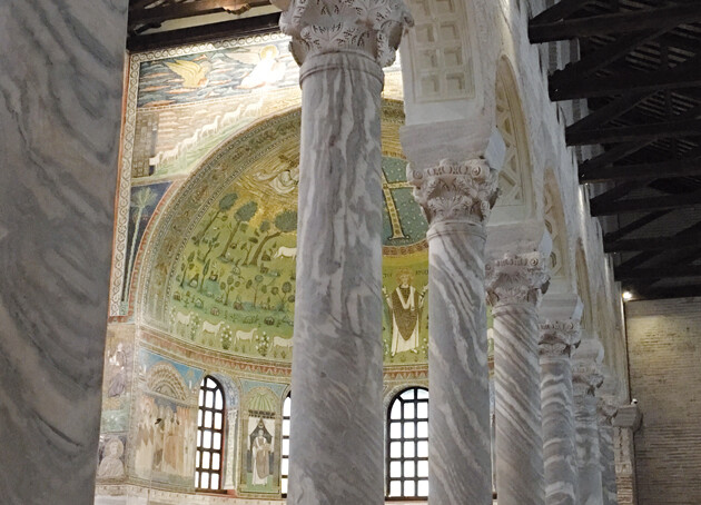 Nell’abside paradisiaca della Basilica di Sant’Apollinare in Classe risplende nella potenza delle immagini – in una narrazione tanto simbolica quanto evocativa – il brano evangelico della Trasfigurazione, un’opera di un’originalità assoluta. Il Cristo trasfigurato è simboleggiato dalla croce splendente di gemme al centro della quale è il suo volto, solenne, incorniciato da luminose perle. I tre apostoli testimoni della gloria del Signore sono presenti nel simbolo di tre agnelli: Pietro alla destra del Cristo/Croce, Giacomo e Giovanni alla sinistra. Mosè ed Elia, sintesi della legge e delle profezie, appaiono a mezzo busto tra nubi gloriose. A completare la visione del mosaico classense è la Mano/Voce del Padre che compare alla sommità del catino absidale come gesto di benedizione. La croce gemmata, al centro di un cielo stellato nel quale brillano novantanove stelle, è accompagnata da preziose iscrizioni greche e latine, sintesi della fede in Cristo Salvatore. Ai piedi della croce è Sant’Apollinare, primo vescovo di Ravenna. Il Santo è rappresentato nella classica posa dell’orante con le braccia alzate e le palme delle mani rivolte al cielo, in un atteggiamento di totale fiducia in Dio. Veste una preziosa casula, sulle spalle porta il pallio, segno dell’amorevolezza del pastore verso il suo gregge, il capo è cinto da un nimbo racchiuso da perle. Accanto a lui è convocata la chiesa ravennate, il suo gregge, simbolicamente evocato da dodici agnelli.