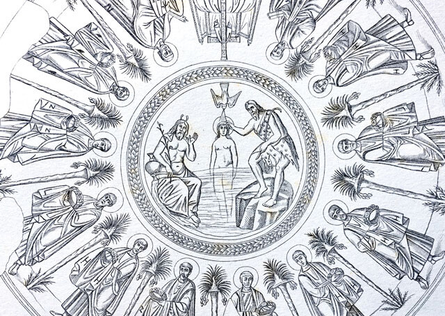 Nella foto, rilievo della composizione dei mosaici del Battistero degli Ariani