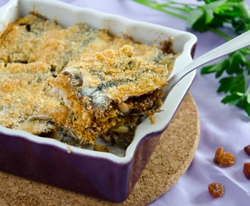 Ingredienti: 2 mandaranci, 800 gr. di sarde, 100 gr. di pane grattugiato, 50 gr. di uvetta, 30 gr. di pinoli, 3 acciughe sotto sale, diliscate e lavate (oppure sott’olio). Un ciuffo di prezzemolo, 5 cucchiai di olio evo, sale e pepe.