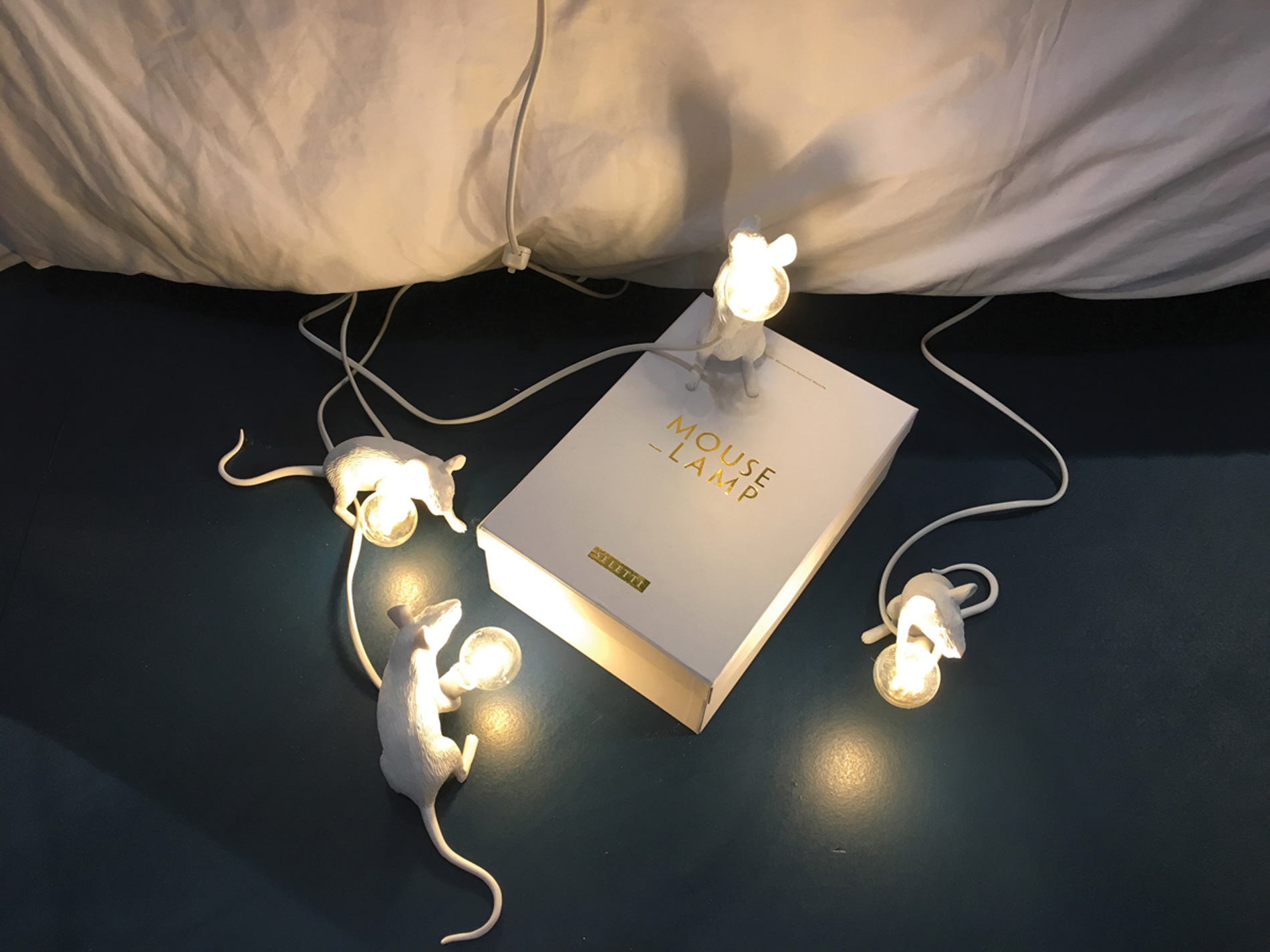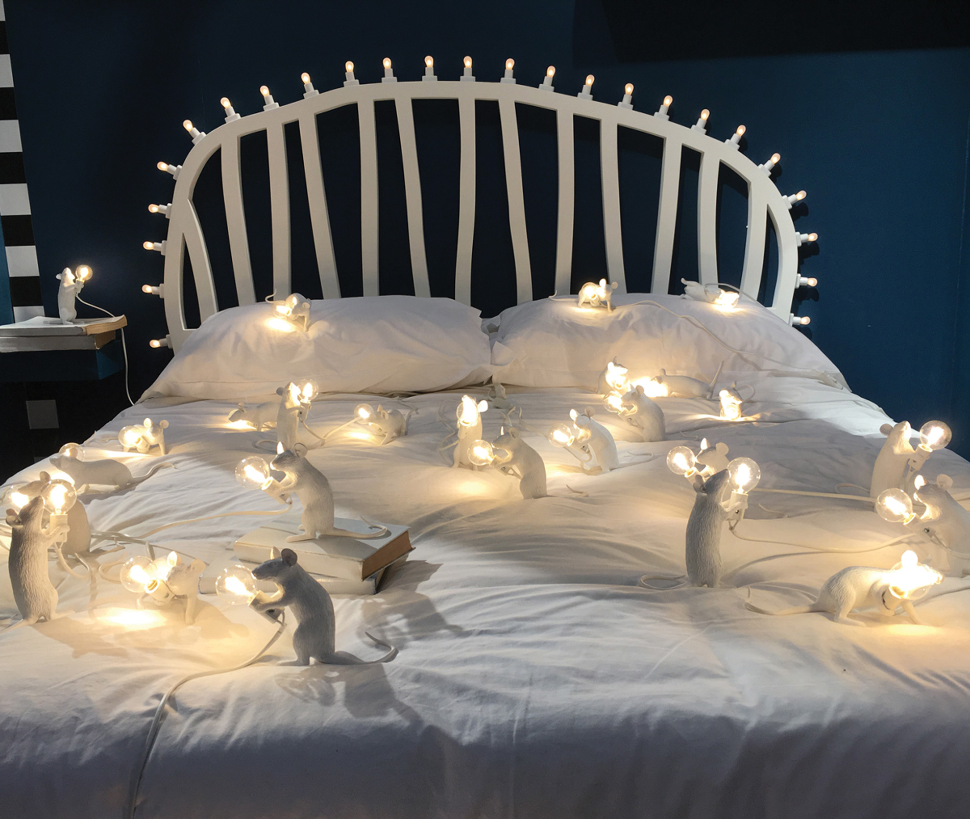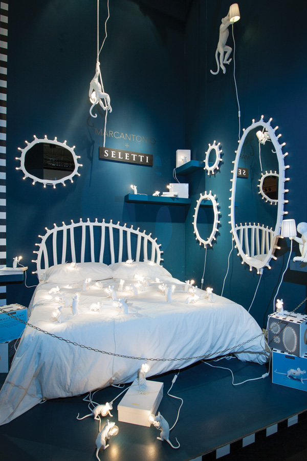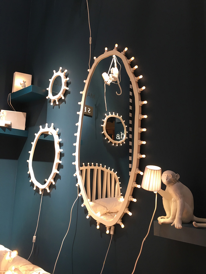 Alla kermesse parigina pensata come una grande moodboard di colori, profumi, setting dedicati a questa dimensione sussurrata, erano molte anche le presenze italiane ospitate nelle quindici sezioni tematiche suddivise in tre macro aree: Maison, Objet e Influences. Uno degli stand più divertenti era quello di Seletti che ha presentato tre nuovi oggetti – veramente silenziosi – della collezione Estetico Quotidiano: il bicchiere in vetro a doppia camera – per liquidi caldi e freddi –, il cartone per il latte e il bollitore per il latte, entrambi in vetro borosilicato, rigorosi e trasparenti. Sempre da Seletti si sono visti gli Hybrid rugs, ironici tappeti/ arazzo in poliestere riciclato al 100% 100 disegnati dal duo CTRLZAK, e Luminarie, il nuovissimo progetto dell’artista e designer Marcantonio Raimondi Malerba, a metà strada tra il light design e l’oggetto di arredo: tre specchi – piccolo, medio e grande – e una testiera per il letto di legno in forme irregolari decorati da tante piccole lampadine che, oltre ad illuminare, aggiungono un tocco onirico e fiabesco all’ambiente, seguendo la stessa ispirazione, trasognata e gentile delle Monkey Lamp e delle Mouse Lamp del giovane designer romagnolo.