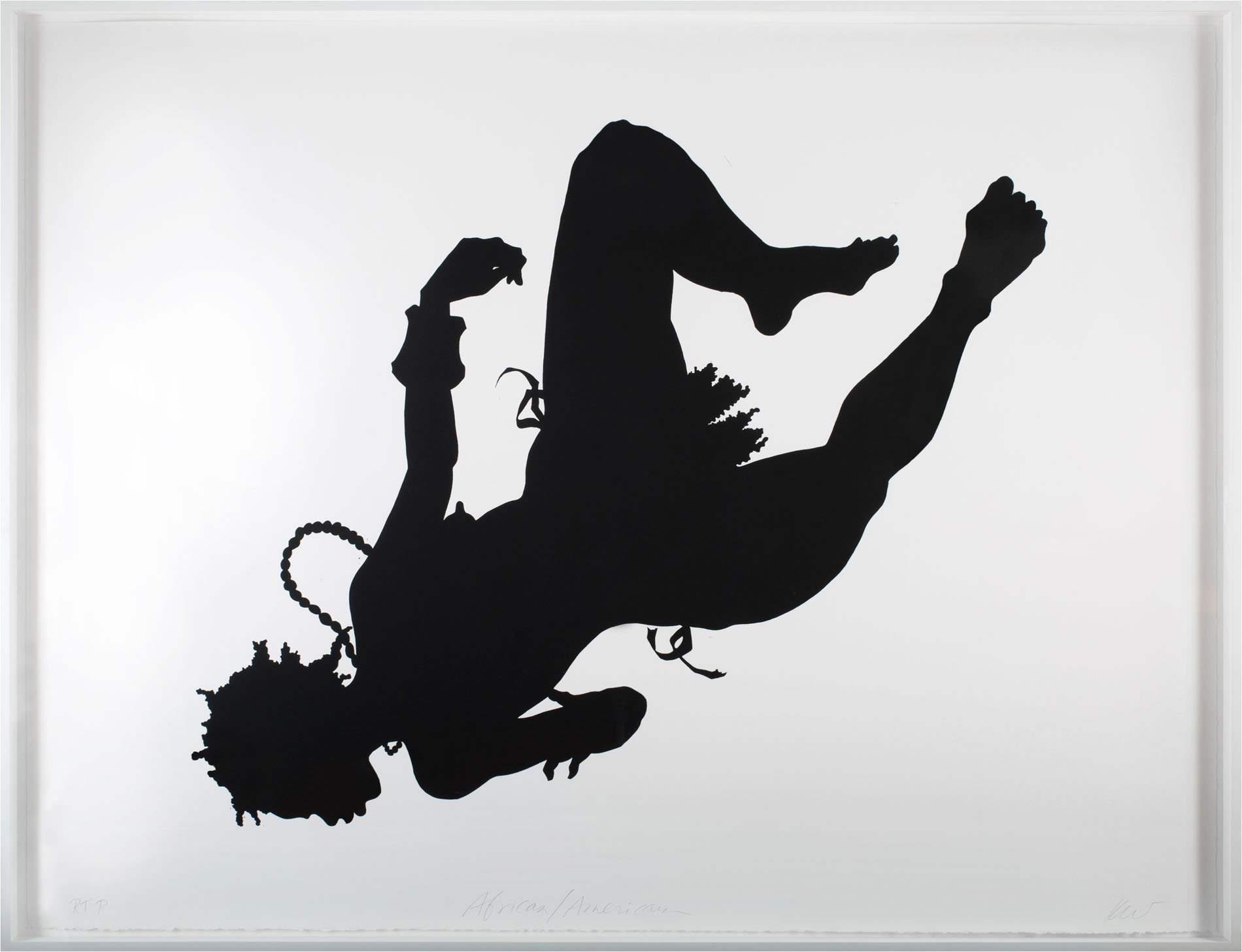 Virando all’attualità, Kara Walker (1969) affronta tematiche non distanti, ma con tecniche e argomentazioni diverse se pure sempre a partire dal colore bianco e dal suo opposto. Nella varietà di impiego dei media, sono famose le sue lanterne magiche e installazioni di silhouettes di carta che l’artista ha cominciato ad utilizzare dall’inizio degli anni ‘90. La scelta della tecnica non è ininfluente perchè dal tempo della sua importazione negli Stati Uniti nel corso del ‘700 ha avuto un lungo successo fra le classi aristocratiche e l’alta borghesia dove diventò una pratica insegnata alle signorine della middle class. Il legame storico di questa tecnica alla ritrattistica così come la semplificazione dei lineamenti fisiognomici e la riduzione al bianco/nero dello sfondo e delle sagome sono elementi che a livello simbolico restituiscono il riduzionismo su cui si basa anche la costruzione degli stereotipi razziali.