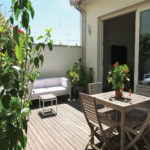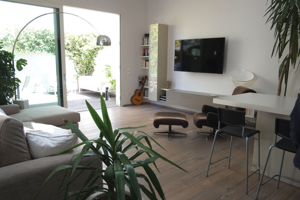con divani e area cucina-pranzo collegati ad un grazioso terrazzo-giardino o sviluppati