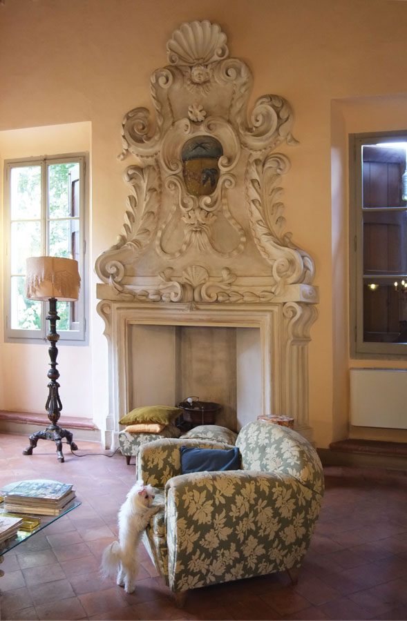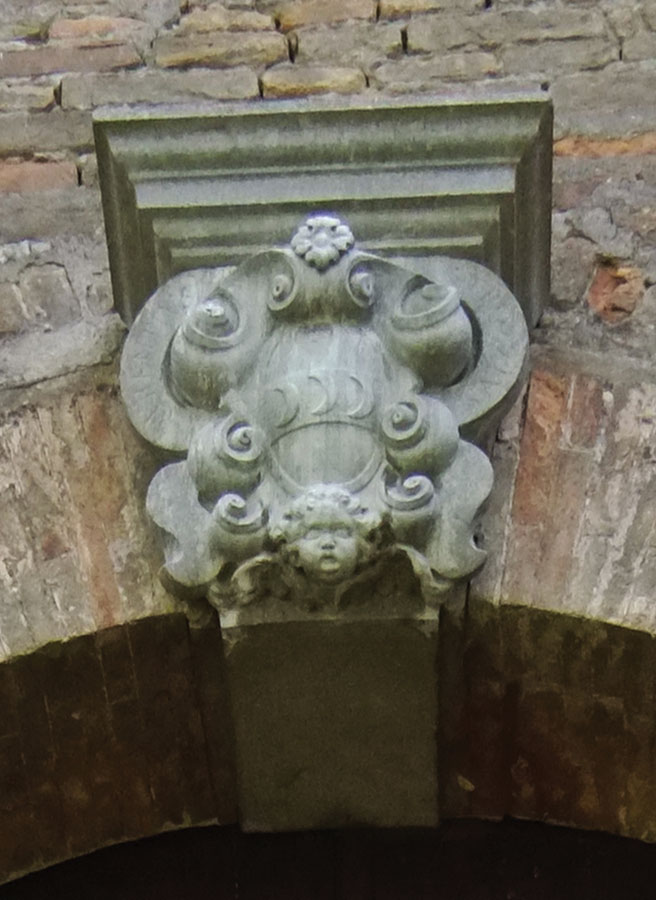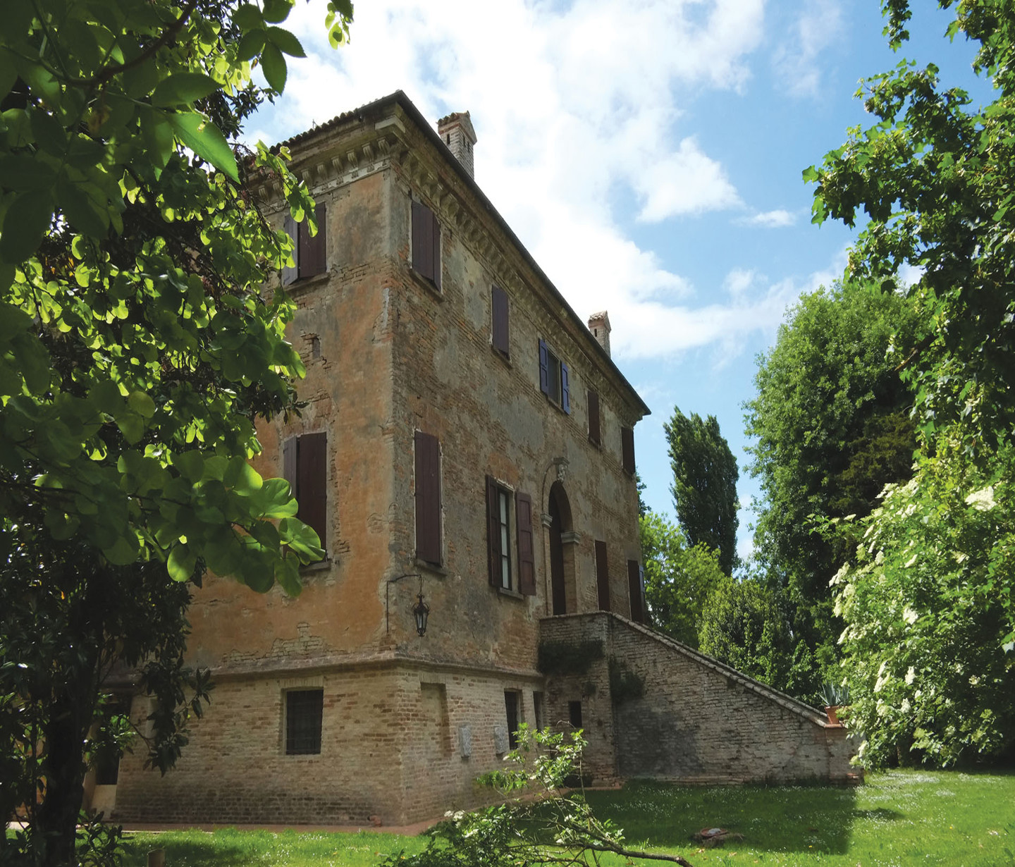 In realtà la vicenda delle successioni di proprietà della villa inizia ben prima, come rivela il concio in chiave dell’arco del portale di ingresso al piano nobile, che si raggiunge al culmine di una possente rampa a grandi gradini in cotto. Nel blocco in pietra d’Istria troviamo scolpito uno stemma a scudo centrale riportante tre lune crescenti, mentre nel nastro lapideo che guizza attorno allo scudo è inciso il nome “Laurentius Strozzius” seguito dalla data “1691”. Dunque alla fine del XVII secolo la villa apparteneva alla famiglia dei conti Strozzi di Ferrara ma, come già suggeriva Umberto Foschi quarant’anni fa, l’anno 1691 non appare credibile come data di costruzione ex novo del palazzo, poiché il portale sembra essere inserito in un secondo momento nella facciata di una struttura eretta in epoca precedente, probabilmente circa un secolo prima (Foschi 1976, p. 13) secondo il modello della villa-castello. In mancanza di notizie sull’anno di fondazione del palazzo, se ne è dunque indicata come prima proprietaria la famiglia Strozzi, anche per la presenza del toponimo “Casino Strozzi” nella cartografia settecentesca del territorio, che induce a pensare quindi ad una residenza più legata ai piaceri venatori e meno ad un centro agricolo, anche in virtù della presenza in quei tempi di zone vallive (Ricci 2010, p. 4). Il racconto della storia della sequenza ereditaria successiva al 1691 prosegue all’interno del palazzo, quando dal vasto salone passante del piano nobile si accede alla prima stanza a destra, un salotto con poltrone e divani ornato dall’imponente sagoma di un camino barocco, decorato con un ricco apparato di volute, cartocci, mascheroni, conchiglie e rosette a stucco. Al centro della composizione campeggia un altro scudo in cui si trovano riuniti gli stemmi gentilizi degli Strozzi (quarto inferiore a sx: le tre lune crescenti), dei Rasponi (quarto inferiore a dx: le due zampe leonine incrociate), e dei Cilla (metà superiore: la rondine nera). Infatti, nel 1735 Giacoma Strozzi, ultima erede della famiglia, sposa Michele Felice Cilla detto Andrea e lo rende padre di cinque figli, uno dei quali, chiamato Nicola, sposa a sua volta Laura Rasponi (Uccellini 1855, p. 100). Tra le nipoti di Nicola ci sarà la futura contessa Bonarelli, che nel febbraio 1788 entra in conflitto con gli eredi diretti, pretendendo i beni dello zio, anche se la vertenza giudiziaria in realtà sembra darle torto. In ogni caso la figura ambigua della nobildonna ha lasciato tracce nella memoria popolare, portando alla comparsa del toponimo attuale del palazzo, che in seguito troviamo indicato come “Villa Cavallini” (Savini 1912, p. 37). Il nome deriva dai proprietari del primo Novecento, una nota famiglia di Lugo legata alla produzione e al commercio della canapa, il cui stemma, un cavallo bianco rampante su fondo azzurro, si trova incastonato nel camino barocco del salotto al piano attico, dove vive Rita Giordani, nipote di Chiara Cavallini e attuale proprietaria della villa insieme al fratello Pier Giacomo.