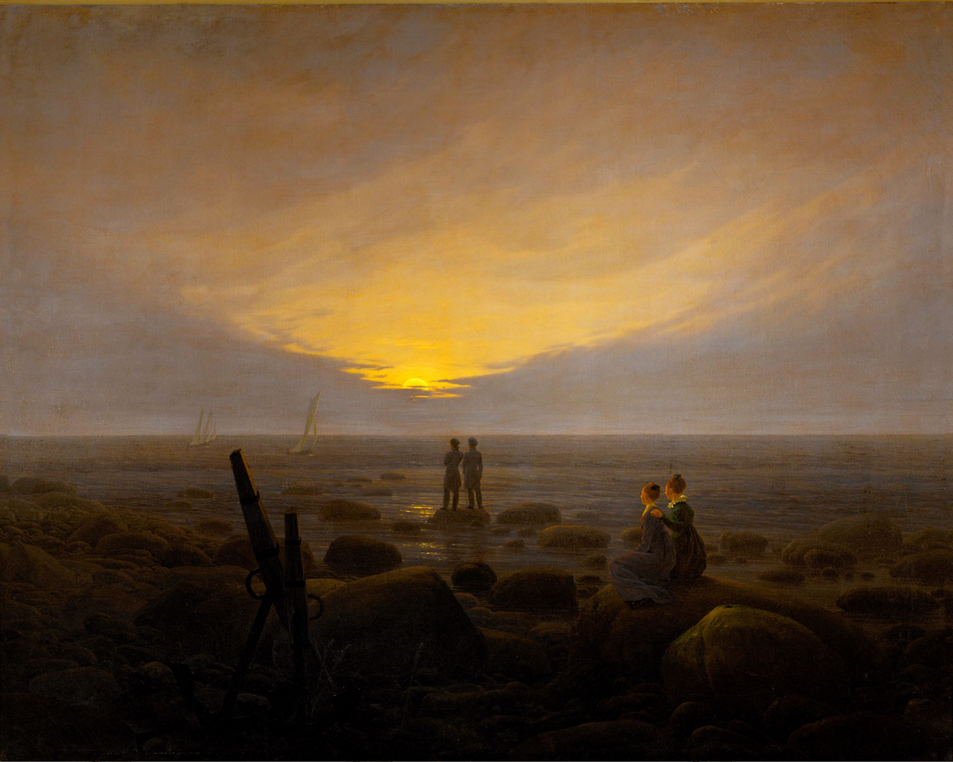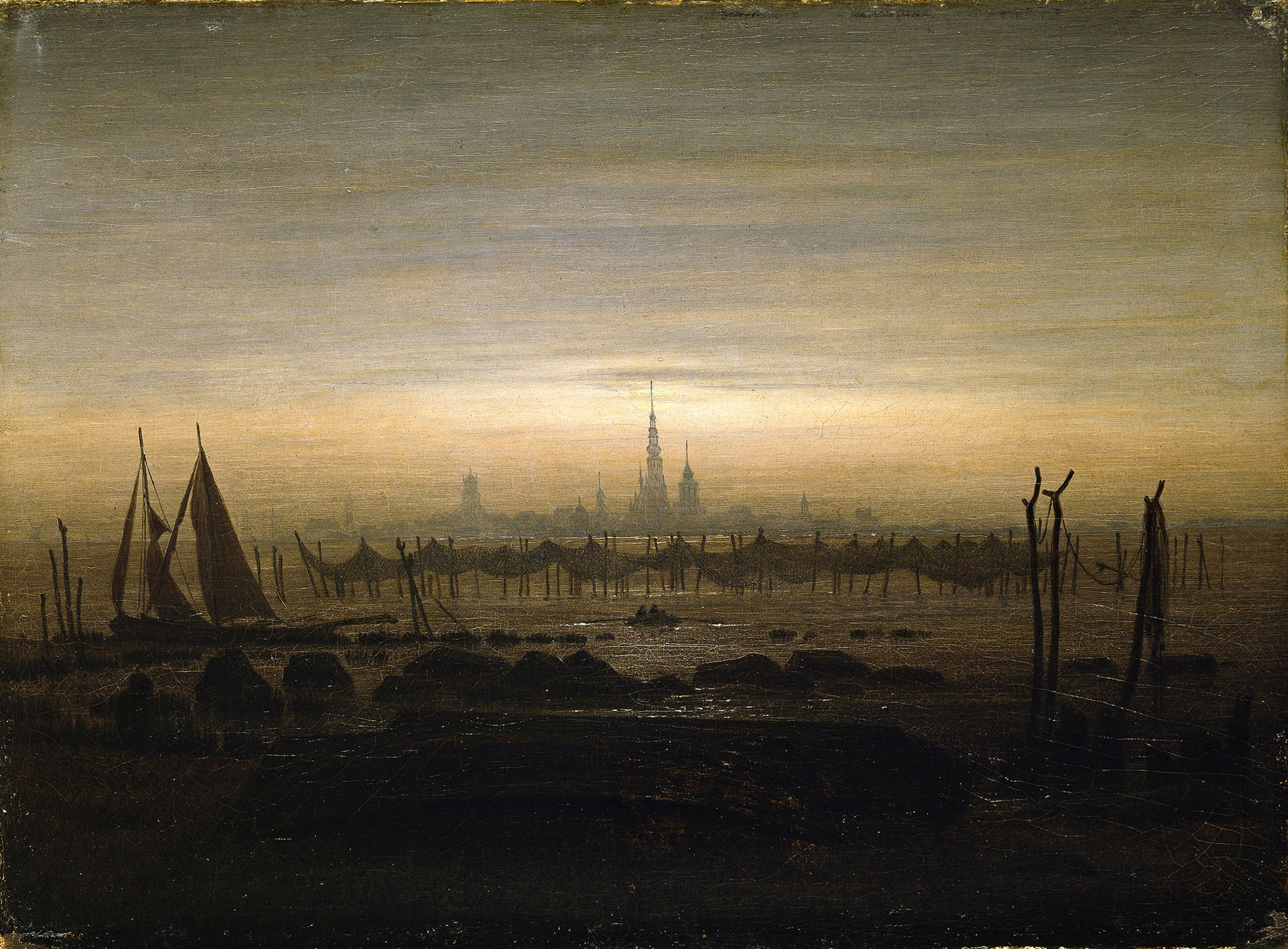 Ravenna è davvero, però, tutta un’illusione? Il De Vogüé non può mancare di fare una visita alla “selva oscura” di Dante, la Pineta. Dopo averne riscontrato i danni dovuti «a qualche inverno troppo duro», e una volta uscito da «questo labirinto»13 di colonne arboree,14 gli viene incontro «uno spettacolo magico»: la visione di un luogo, né terra, né mare, che s’intravede tra «le arcate dei grandi pini, immobili e neri […]». Si tratta di «una piana indefinibile, steppa, torbiera, palude, [che] srotola la sua tela vuota fino alle linee incerte del mare»,15 come uno di quei mari del nord dipinti da Caspar David Friedrich, o come un paesaggio fiammingo-olandese o nilotico.16 E in questo apparente “deserto” – altra parola chiave che ritorna continuamente nei memoriali dei viaggiatori stranieri – dove di primo acchito non v’è «nessun accadimento, nessun movimento», in realtà qualcosa si muove. È, come scrive il De Vogüé, «un’apparizione fantastica», in cui «grandi vele, dai vivaci toni arancioni e color zafferano, si spostano lentamente rasoterra, senza che si scorgano le barche che le portano nei canali: un miraggio in più, oltre a quelli che il baluginare di un’aria bruciante fa tremare sui piani lontani di questa solitudine».17