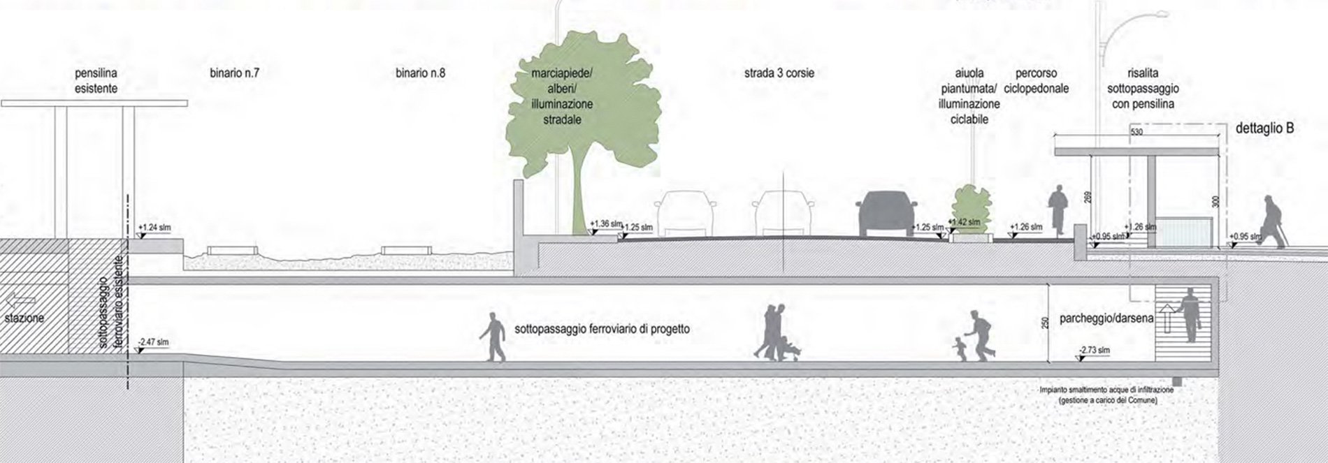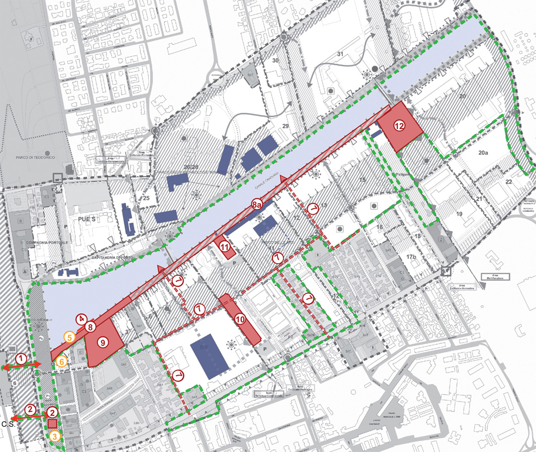 I progetti, inquadrati all’interno delle previsioni del POC Tematico Darsena, sono tutti interrelati tra loro e scorrendo i contenuti principali ne emerge l’aspirazione ad un quartiere accessibile in continuità con il centro storico, tramite il prolungamento dell’esistente sottopasso ferroviario – trasformato in galleria d’arte – fino a emergere ancora più vicino alle banchine, mentre Piazzale Aldo Moro viene confermato e incrementato nella sua vocazione di nodo intermodale che potrebbe smistare treno, auto e bici (nuova stazione di bike sharing) con il collegamento al mare tramite battelli lungo il Canale (interventi 1 e 2). Anche la valorizzazione dell’acqua passa attraverso l’accessibilità e il progetto di un pontile privo di barriere architettoniche, per l’attracco di una nave (anch’essa accessibile) per i trasporto di persone da e per il mare (intervento 4); una seconda imbarcazione potrebbe effettuare il trasporto anche di cicli lungo itinerari didattici e visite guidate (intervento 5). L’intervento maggiormente strategico, capace di generare un processo rigenerativo più ampio, potrebbe essere la realizzazione della nuova rete fognaria in corrispondenza della quale è prevista la posa di una capillare rete in fibra ottica per il cablaggio completo del quartiere (intervento 8).