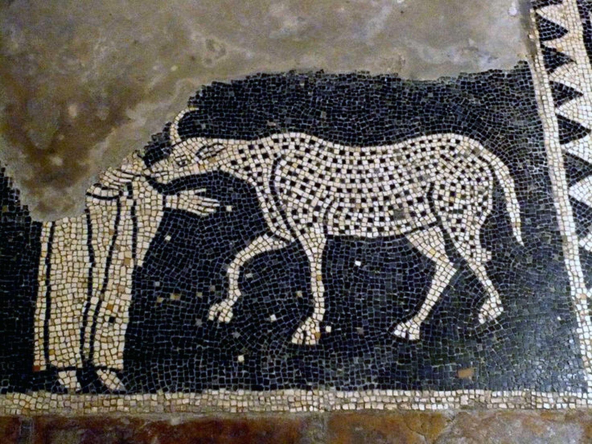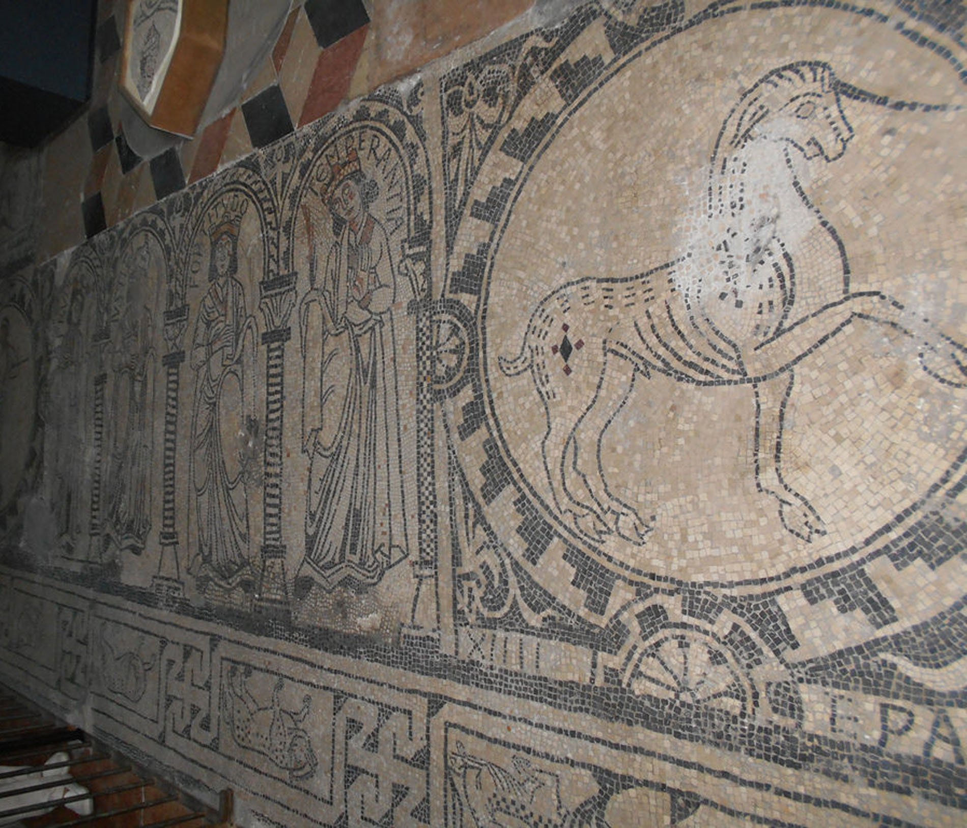 Durante l’XI-XII secolo i pavimenti musivi degli edifici sacri si caratterizzarono sempre di più dal punto di vista materico e iconografico. All’utilizzo di pochi colori dominanti ripetuti nel fondo e nelle bordure, alla tecnica più grossolana e all’impiego dell’opus sectile si affiancarono temi propriamente romanici con personaggi tratti dall’Antico Testamento, con allegorie dei dodici mesi dell’anno accompagnate dai relativi segni zodiacali, con visioni enciclopediche, geografiche e cosmogoniche. Oltre a personaggi che prefigurano il Nuovo Testamento, Sansone, Giona, Davide, Noé, Caino e Abele, si trovano rappresentati santi locali con episodi della loro vita. Frequenti sono anche i temi tratti dalla mitologia e dall’antichità, Teseo e il Minotauro, e i cicli ispirati alla letteratura, alla storia e alle leggende popolari, come quelli che fanno riferimento all’ascensione di Alessandro Magno, a Re Artù e ai cicli epici, alle imprese dei paladini di Francia. Ma le immagini più comuni sono quelle degli animali, reali o fantastici, soggetti tipici dei bestiari, frutto del progresso del sapere enciclopedico e delle conoscenze geografiche e zoologiche. L’interesse per le raccolte di racconti sugli animali, nonché la loro associazione a determinate caratteristiche, comportamenti, vizi e virtù, li hanno resi in epoca medievale soggetto prediletto e ampiamente utilizzato.