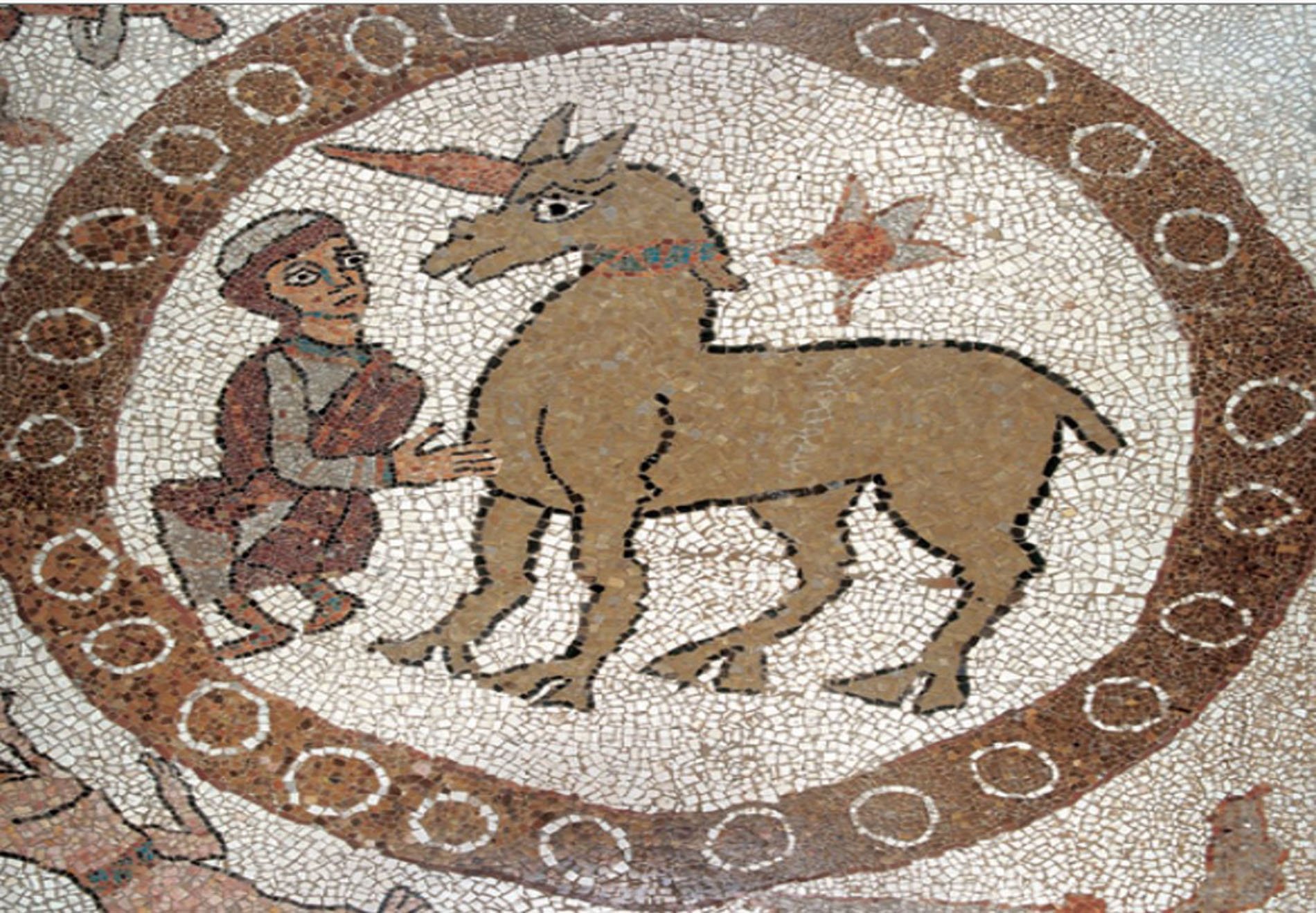 Tra i mosaici del XII sec. di San Vitale raffiguranti animali tratti dai bestiari medievali si riconosce un interessante capro che presenta alcuni caratteri tipici dell’unicorno, animale favoloso in forma di quadrupede: oltre al lungo corno “arricciato” sulla fronte si riconoscono alcuni ciuffi di criniera, una coda leonina e zoccoli bovini. In questo pannello l’unicorno è fronteggiato da una testa di antilope e delimitato, lungo il margine sinistro, da due volatili riccamente policromi che fungono da bordo decorativo. Si stratta di un uccello acquatico, un anatide, forse un Germano reale, dal piumaggio colorato, dal largo becco, dalle zampe corte e palmate; l’altro è probabilmente un fasanide riconoscibile dalla coda più lunga e dalle zampe più esili.