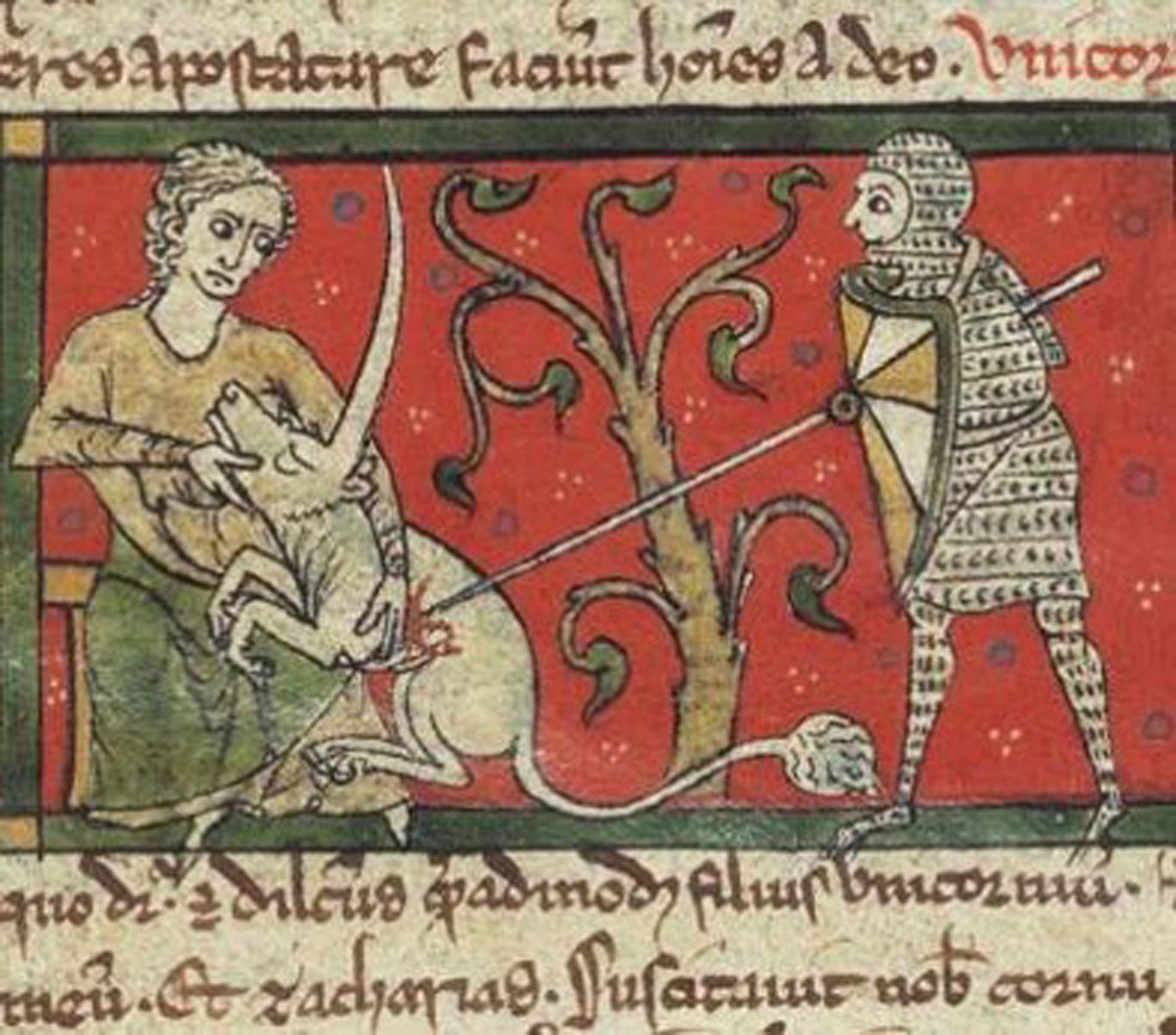 Contatti diretti tra l’animale e l’uomo si hanno nella cattedrale di Santa Maria Annunziata di Otranto, dove nel presbiterio, in uno dei sedici medaglioni raffiguranti animali e figure umane mitiche, un unicorno è affiancato dalla rappresentazione del monaco Pantaleone, ritenuto l’autore-registra del mosaico, e in San Savino a Piacenza, dove il grande mosaico della cripta con la raffigurazione dei mesi è compreso in un quadrato con cornice geometrica con scene figurate nelle quali ben si riconosce una dama con unicorno .