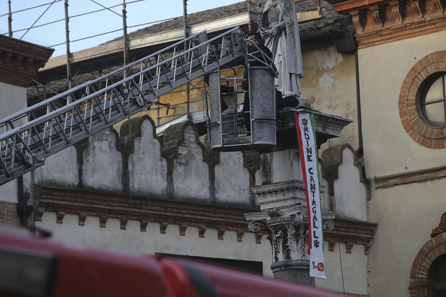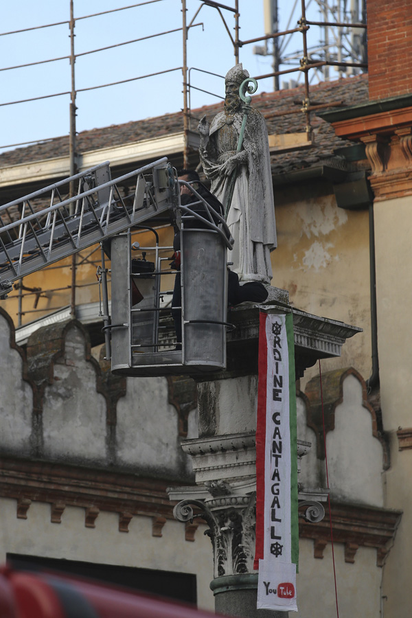 Un ventenne nel corso della notte tra il 25 e il 26 febbraio si è arrampicato in cima a una delle due colonne in piazza del Popolo che sorreggono due statue. Una volta salito in cima ha appeso uno striscione verticale con scritto “Ordine Cantagallo” su sfondo tricolore. Il giovane ha utilizzato una scala per arrivare al punto più alto ed è sceso solamente verso le 8, dopo alcune ore passate in vetta, con l’intervento di un’autoscala dei vigili del fuoco. Sul posto le forze dell’ordine che hanno chiuso l’accesso alla piazza e un’ambulanza che ha preso in affidamento il ragazzo per accertamenti medici in ospedale.