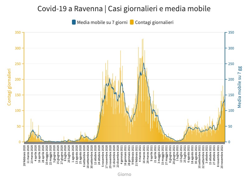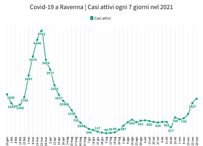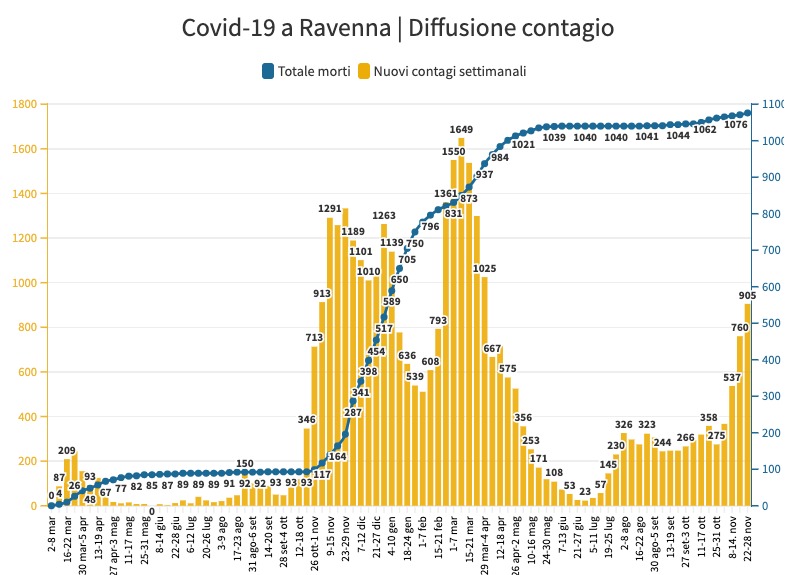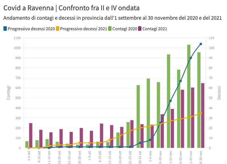 Nel mese di novembre in provincia di Ravenna ci sono stati 2.800 contagi e 15 morti per Covid. Nello stesso mese del 2020 i due numeri erano stati rispettivamente cinquemila e 99. Nel 2020 vennero fatti 49mila tamponi, quest’anno sono stati 57mila (vengono conteggiati anche i rapidi). Allargando gli estremi del periodo ai tre mesi dall’1 settembre al 30 novembre quest’anno ci sono stati 35 decessi e l’anno scorso 104. Il confronto a distanza di un anno fra seconda e quarta ondata della pandemia mostra il ruolo dei vaccini.