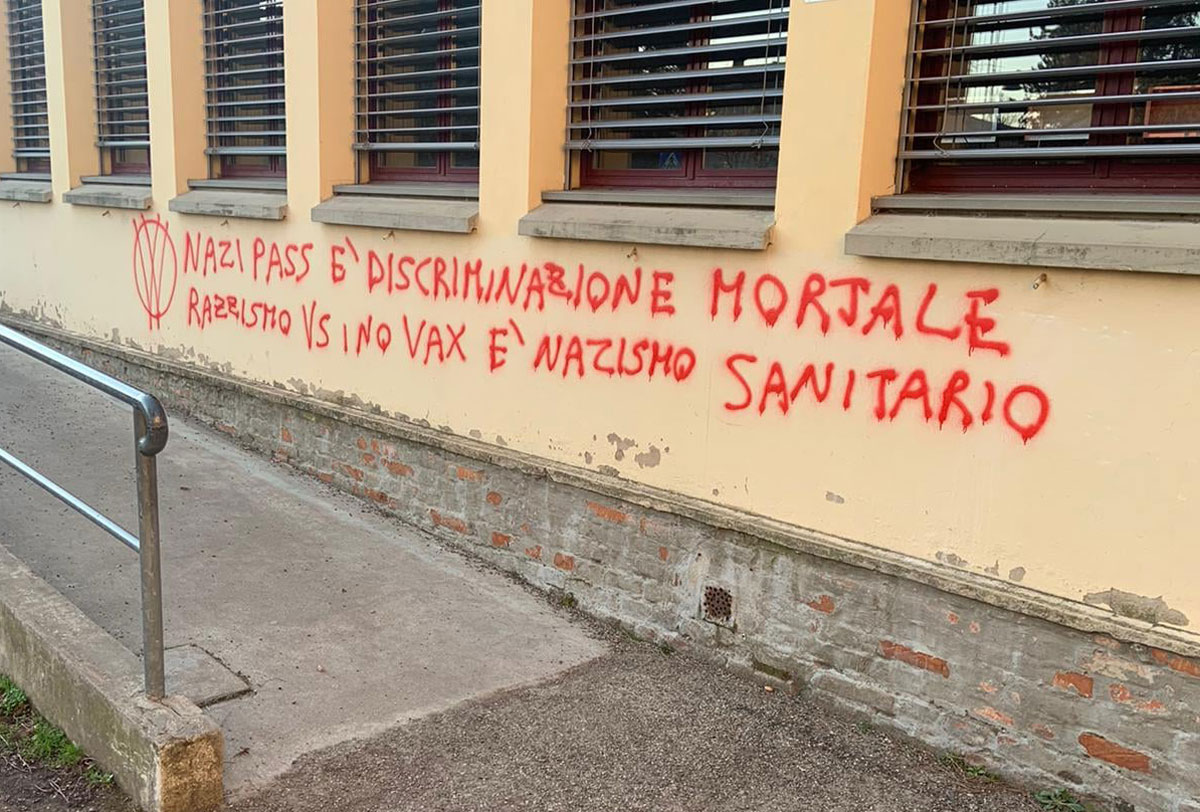 Scritte no vax e offese rivolte al mondo sindacale sono apparse nella notte sui muri della Cgil e della scuola di Massa Lombarda.