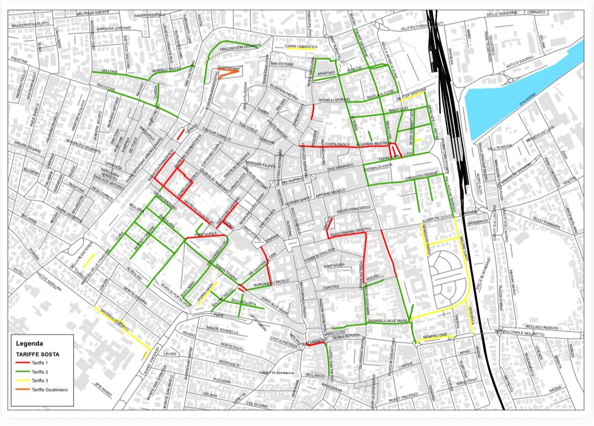 A queste si aggiunge la zona tariffaria speciale in largo Giustiniano, con una tariffa unica giornaliera di 3,30 euro e possibilità di abbonamento mensile a 45 euro. Nella mappa seguente è possibile vedere il dettaglio delle tre nuove zone tariffarie.