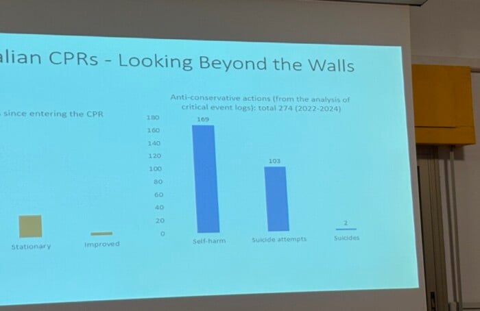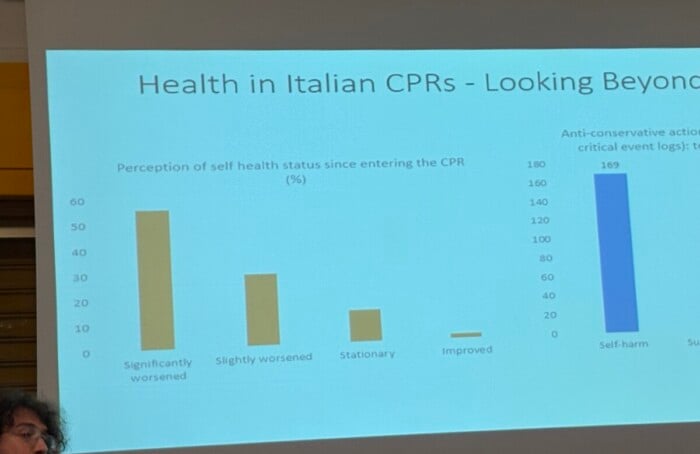 Nei dieci Cpr italiani ogni anno entrano circa seimila stranieri (meno dalla metà vengono poi effettivamente rimpatriati nei Paesi di origine). «Nel triennio 2022-2024 – ha detto Cocco – si sono registrati 169 atti di autolesionismo, 103 tentativi di suicidio e due suicidi. Il 70 percento delle persone all’interno assume almeno uno psicofarmaco, il 17 percento ne prende due. E ricordiamoci che siamo di fronte a zero diagnosi di patologie psichiatriche, altrimenti non avrebbero avuto l’idoneità all’ingresso. Allora quel 70 percento è pura sedazione».