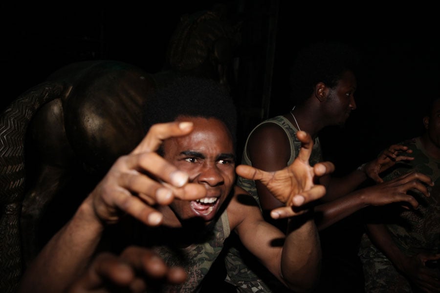 Tutto comincia con una sorta di preghiera laica. E in qualche modo, se sei ravennate, senti qualcosa accadere, qualcosa che ti è curiosamente familiare ma che questa volta prende forma e diventa collettivo: ti trovi a recitare con la tua voce, tra tante voci, il primo canto della Divina Commedia. E lo fai lì, di fronte a quella tomba davanti alla quale sei passato mille volte in bici o a piedi, quel luogo così parte della tua geografia quotidiana e che pure ogni volta (beh, insomma, se non ogni volta almeno alcune centinaia) hai pensato, “ehi, ma questa è davvero la tomba di Dante e io ci passo davanti solo perché così faccio prima ad arrivare a casa”. Perché i mosaici mica li vedi tutti i giorni, ma la tomba di Dante, quella sì, e ti affezioni per forza a quel suo curioso understatement. Del resto vivi in una città dove se per strada ti domandano “dov’è via Alighieri” devi chiedere, “quale Alighieri?”. Dove c’è un liceo e pure un teatro dedicato al Sommo, che di teatro non ne ha mai scritto. O forse sì. O forse invece la Commedia è anche una grande opera teatrale che appunto prende forma, oggi, in questo 2017, a partire da questa specie di preghiera laica e in qualche modo liberatoria e identitaria che è recitare Dante tutti insieme guidati da Marco Martinelli ed Ermanna Montanari nel loro Inferno, lungo via Mariani (davanti appunto al suddetto teatro) e poi fino a Sant’Apollinare Nuovo. Qui ci appare Beatrice nei panni di una giovane, emozionata e quasi commovente fanciulla. La luce del giorno sta calando e sdilinquirsi in tanta bellezza ed emozione è quasi inevitabile. Circondati da tanti altri più o meno sconosciuti, mentre le telecamere della Rai sono lì a ricordarti che in effetti l’evento è piuttosto memorabile. Ed è così che arrivi al Rasi, il teatro dove sei stato mille volte, dentro quella chiesa sconsacrata, quel luogo familiare quanto la tomba di Dante. A farti entrare sono di nuovo loro, Ermanna Montanari e Marco Martinelli, di bianco vestiti, anime della compagnia delle Albe a farti da Virgilio. La porta è strettissima, si entra uno alla volta, e mica c’è gente fuori a chiacchierare, come al solito. Qui si entra nell’Inferno. E che non sia particolarmente accogliente lo capisci prima di varcare la porticina, perché già da fuori si sentono grida e già ti immagini che il Rasi non sarà come lo conosci. E infatti, la prima sensazione è paura e disagio. Provi a ridacchiare, ma in realtà quei mitra ti incutono un po’ di timore. E anche Roberto Magnani nelle vesti di uno spietato dittatore: mentre parla ti sembra di scorgere in ogni parola una minaccia già diventata reale. E poi ti dici, no, dai, è suggestione. Da quel momento inizia il grande gioco scenico, come in una meravigliosa scatola magica si viene accompagnati, o meglio scortati o trascinati, su e giù per il teatro che è diventato, come in un luna park stregato, una “casa degli orrori” dove creature spaventose gridano, ti si avvicinano, ti minacciano.