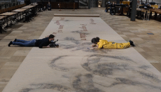 Si tratta della monumentale opera d’arte ispirata al capolavoro dantesco realizzata da Enrico Mazzone – artista torinese classe 1982 – su una bobina di carta lunga 97 metri e alta 4. Un lavoro che ha occupato cinque anni di vita dell’artista, che lo ha portato anche «alla deriva» – ci dice al telefono –, su cui ha lavorato 10, anche 14 ore al giorno, con grande sforzo fisico, oltre che concettuale.