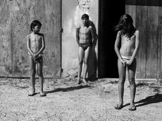 Nello stesso spazio sono esposte anche una quarantina di fotografie di Marco Zanella (Reggio Emilia, 1984) che da quasi due anni ha ramificato la sua indagine a Cotignola: per lui – emiliano con una esperienza nell’atelier di Alex Majoli – la permanenza in Romagna ha significato molto più della semplice realizzazione di un progetto. Non a caso uno dei testi che apre la sua esposizione dal titolo “Scalandré” è tratto dall’intervista a Rosa Casadio, una donna di forte personalità che abita nel paese e ha mille storie da narrare. Alcune fotografie di Zanella fanno parte del ciclo ispirato alle sculture in cartapesta di Varoli mentre una seconda serie si concentra sulla vita di persone e animali, dettagli ambientali e urbani scoperti quasi per caso. Il bianco e nero in grandi dimensioni e a contrasti netti cattura una sorta di confine identitario del luogo: se non possiamo cogliere la vera identità sfuggente di Cotignola è quindi il confine che per sottrazione la rende evidente. Chi o cosa è Cotignola è leggibile in due corpi che si abbracciano, in una costruzione meccanica simile a una mantide religiosa, nell’equilibrio di una enorme massa di balle di fieno. Ancora si intravede nella recinzione a causa del Covid di due vecchie altalene, nelle linee rette – fino a dove è possibile – della sarchiatura dei campi, nell’attraversamento in solitaria di una piazza deserta.