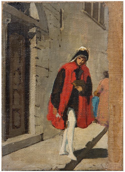 Pochi dipinti, incisioni e volumi d’epoca formano un itinerario raccolto e prezioso, allestito negli spazi della Manica Lunga. Tra le opere più importanti, il celebre “La porta di casa degli Alighieri. Reminiscenze a Firenze” (olio su tela, 1859, coll. priv.), recentemente esposto ai Musei di San Domenico di Forlì, che si potrà ammirare per la prima volta accanto al delizioso bozzetto preparatorio e all’incisione che lo stesso artista ne trasse, quest’ultima concessa dai Musei Civici del Castello Visconteo di Pavia insieme ad un’altra opera.