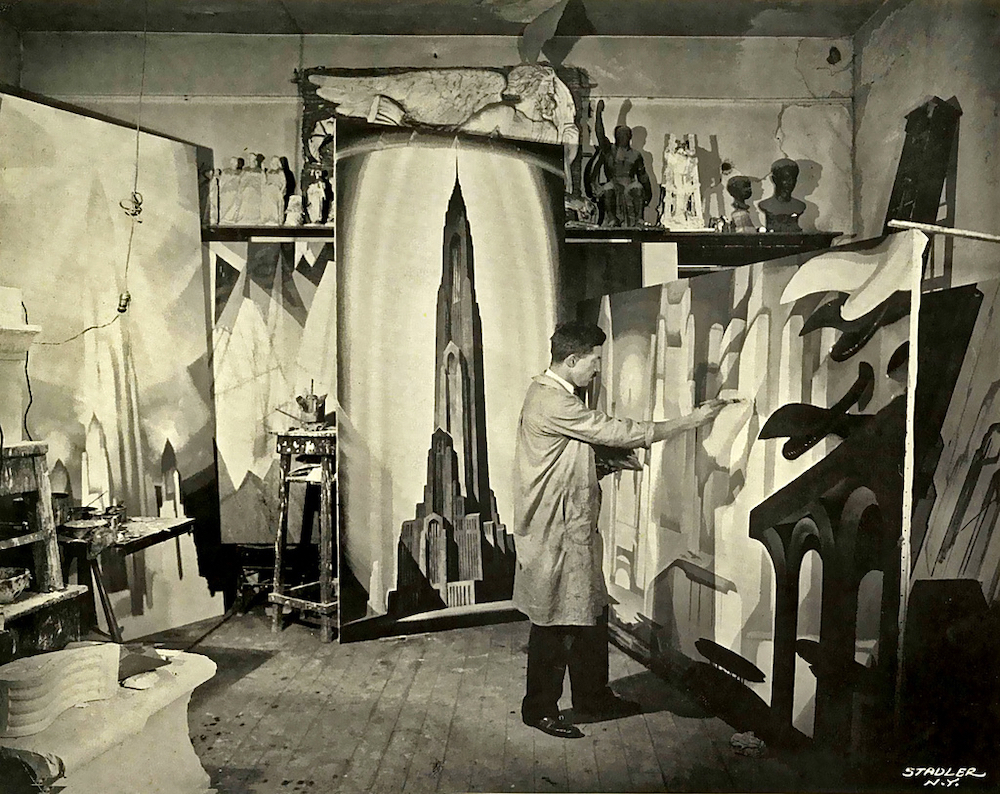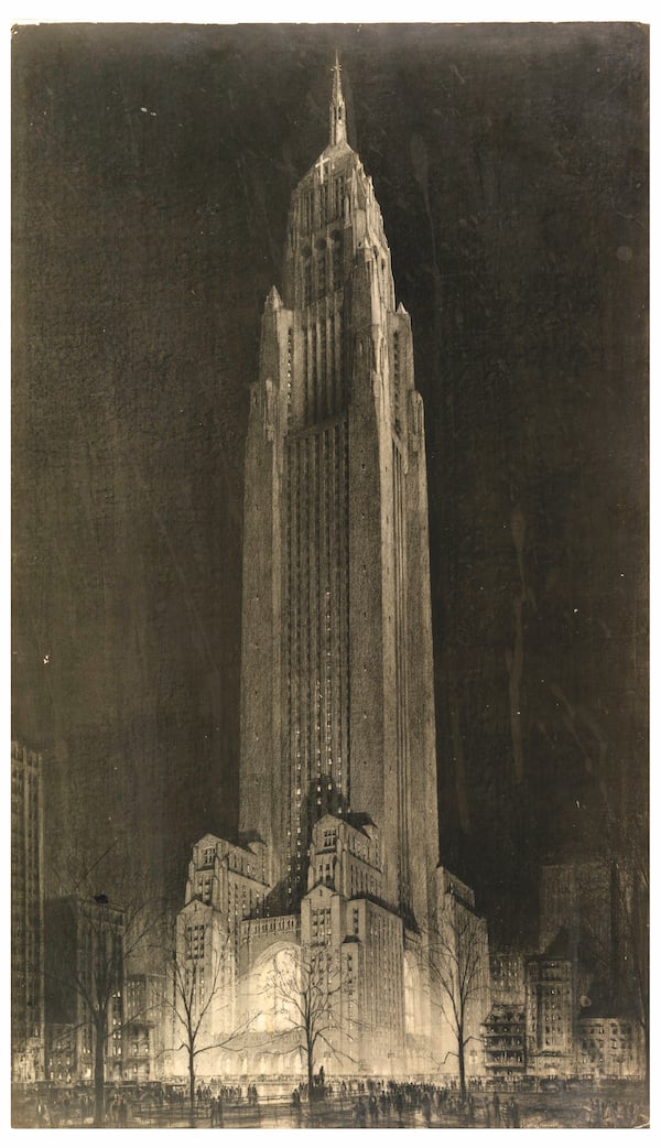 Qual è il tema? Ferriss propone un progetto visionario per risolvere il grande problema della sua e della nostra epoca: come dare Forma all’informe metropolitano? Per far questo, bisogna innanzitutto conoscere il problema. Come fare per avere una visione complessiva dell’enorme metropoli, che, in questo caso, non può che essere New York? La soluzione è salire ai piani alti – come in Ballard – e guardare l’“oceano” artificiale che gli uomini – il capitalismo, gli speculatori e, last but not least, gli architetti – hanno costruito. È lo stesso Ferriss che, in uno dei tanti meravigliosi disegni che costellano il libro, mostra se stesso, davanti a un cavalletto, intento a ritrarre la gigantesca città ai suoi piedi. Da un lato i grattacieli, dall’altro gli abitanti che si muovono in fondo ai “canyon” di NYC.