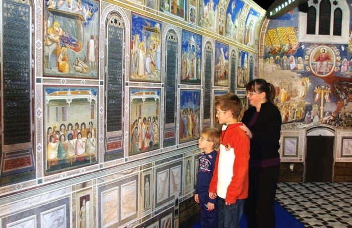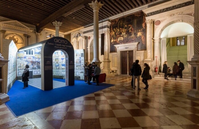 La grande volta e le pareti affrescate di oro e blu, le rappresentazioni di tre episodi della bibbia lungo la navata e le personificazioni delle sette virtù e i setti vizi lungo lo zoccolo: la Cappella degli Scrovegni, affrescata da Giotto tra il 1303 e il 1305 su commissione di Enrico Scrovegni, arriva a Castel Bolognese in una fedelissima riproduzione fotografica in scala 1:4.