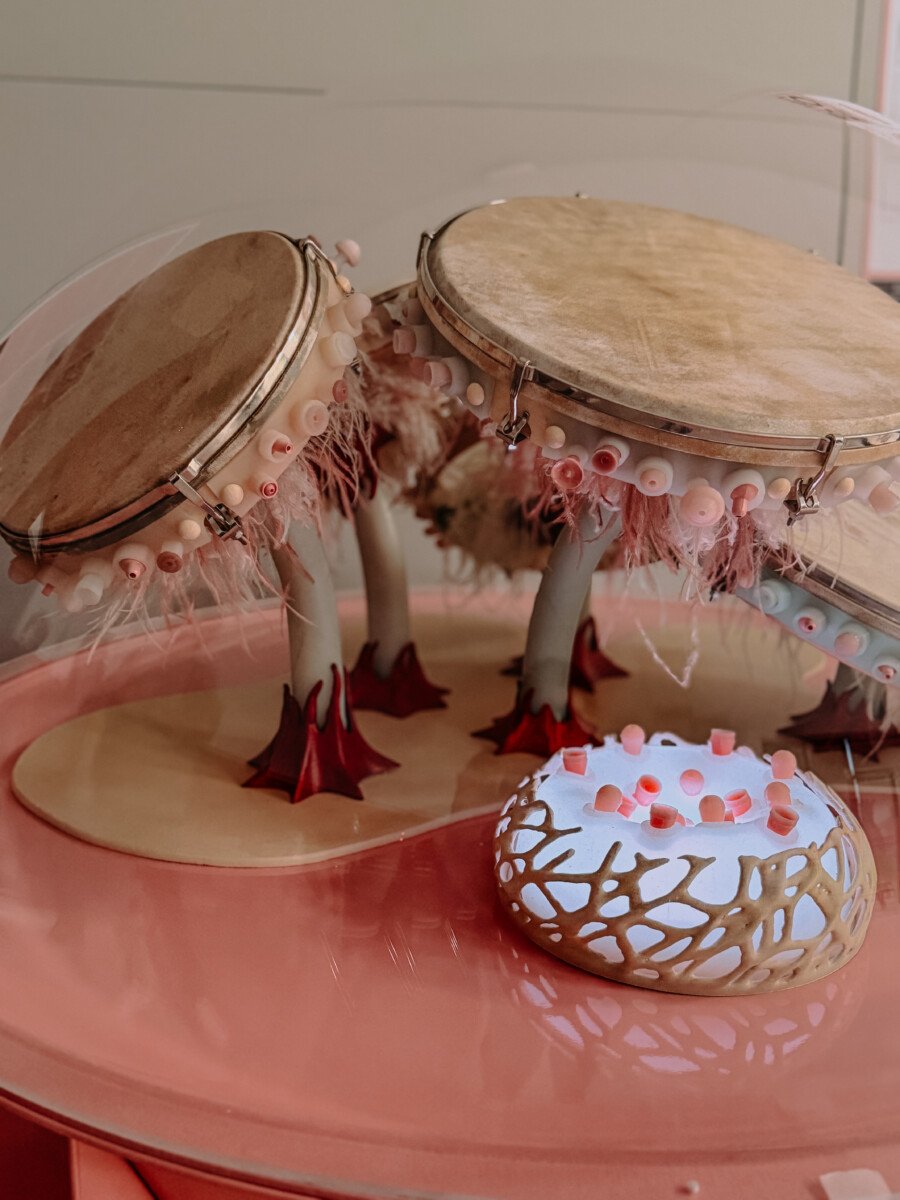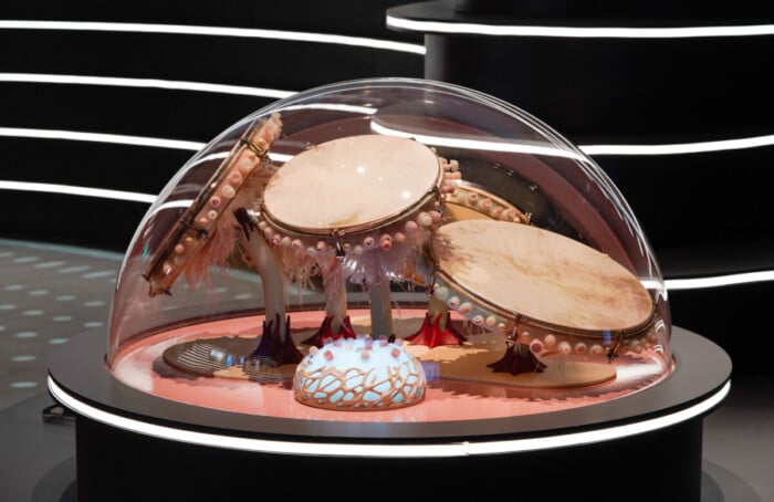 cassa toracica a vista, ed è composto da un apparato respiratorio (la sacca in pelle siliconica, che si rilassa e contrae al ritmo del diaframma, emettendo un leggero soffio) e uno fonatorio, con cinque membrane sonore (sorta di tamburi) sviluppate su strutture tubolari, alcune formazioni papillari e ventose e piumaggio alla base. Quasi tutti gli elementi sono stampati in 3D. I dati sulla qualità dell’aria vengono trasmessi ai tamburi sotto forma di vibrazioni, grazie a un eccitatore elettrodinamico che percuote le membrane, trasformando il rilievo in suono.
