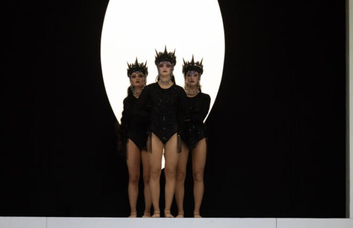 «Verso di noi il proscenio, la realtà materiale dove si muovono personaggi. In fondo alla scena, la dimensione sottile dove esistono le cose che non sono ancora e quelle che non sono più – racconta Fabio Ceresa nelle note di regia – A collegare questi due piani, un percorso astratto composto da cornici concentriche: il varco tra i due universi che percorriamo alla nascita ed alla morte. Lungi dall’essere due mondi distinti, questi due spazi si compenetrano costantemente, perché quello che accade al di qua non è che un riflesso di ciò che si decide al di là. Non c’è morale, non c’è psicologia, ma solo una danza di forze che attraversano il buio e la luce. In contrasto con l’asciutta geometricità della scena, che è ridotta a pura struttura e linea, i costumi incarnano la dimensione sacra e vertiginosa del mito. Il mondo geometrico e rigoroso delle cornici quadrate trova così un controcanto di opulenza sacra, come se l’universo stesso, nel momento in cui si manifesta, non potesse che farlo con un’immagine di tragica bellezza».