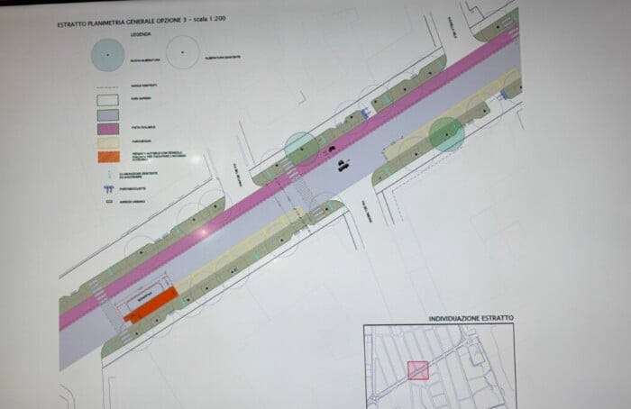 Mettendo quindi da parte per un attimo l’ipotesi 1, la 2 e la 3 hanno alcuni punti in comune: su entrambi i lati un marciapiede da circa due metri e un’aiuola da 2,7 metri, una fila di parcheggi solo su un lato, senso unico per le auto con direzione verso il mare a partire dall’incrocio con via della Prora. L’opzione 2 prevede una corsia per autobus e bici in direzione opposta. L’opzione 3 prevede una ciclabile a doppio senso da 2,5 metri di larghezza e bus insieme ai veicoli privati.