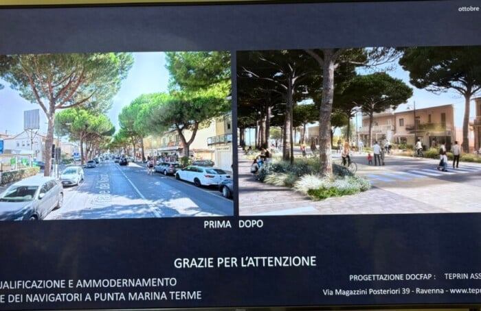 Più spazio per i pedoni, una pista ciclabile, più alberi e più verde, meno parcheggi, veicoli a velocità ridotta in transito a senso unico. In sintesi sarà così il viale dei Navigatori di Punta Marina nel futuro, probabilmente dal 2028 al termine di un investimento di 4,6 milioni di euro finanziato da Snam nell’ambito delle misure di compensazione per il rigassificatore in mare di fronte alla località (come già accaduto per il parcheggio da 435 posti).