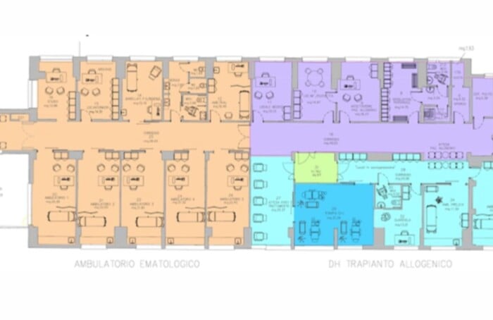 Nello specifico l’intervento comprende la realizzazione di un’area di degenza di circa 200mq dotata di 4 camere singole con un ambiente di preparazione in ingresso; la realizzazione di un Day Hospital/Day Service di circa 300 mq per le terapie continuative; adeguamento degli ambulatori e dei percorsi protetti per un’area di circa 300 mq e infine adeguamento e potenziamento delle aree di raccolta e processazione cellulare per una superficie di circa 600 mq.