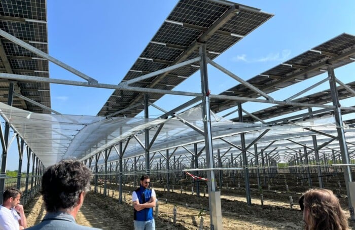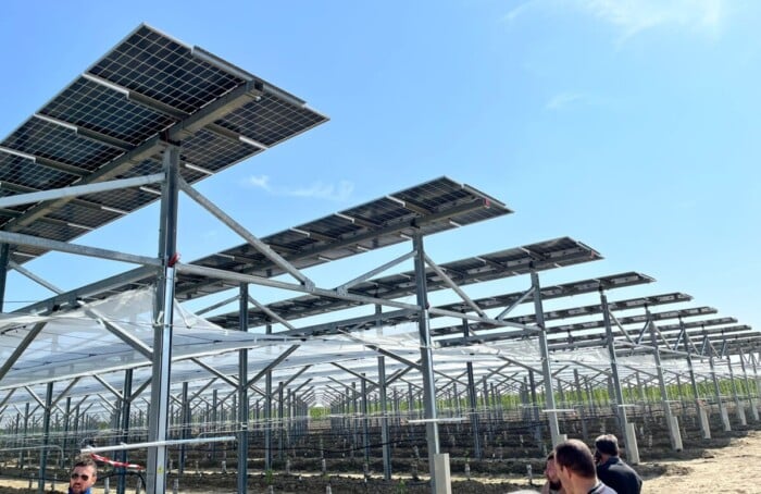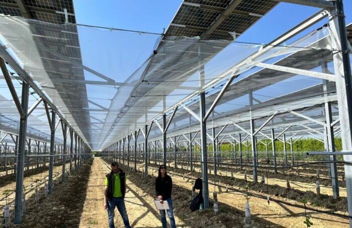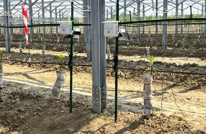 Dal punto di vista tecnico, l’infrastruttura è particolarmente avanzata: composta da oltre 1.500 moduli fotovoltaici da 645 watt ciascuno, suddivisa in più sezioni e dotata di sistemi di monitoraggio continuo. Sensori Plantvoice installati sia nell’ambiente sia direttamente nelle piante consentono di rilevare parametri fondamentali come stress idrico, temperatura e flusso linfatico. Tutti i dati raccolti confluiscono in tempo reale in una piattaforma digitale proprietaria (DSS – Decision Support System), che rappresenta il “cervello” del sistema. Questo software consente di gestire sia la componente agronomica sia quella energetica, regolando automaticamente l’orientamento dei pannelli non solo in base al sole, ma anche alle condizioni delle colture. «Il valore del dato è centrale – sottolineano i tecnici – perché permette decisioni precise e una gestione anche da remoto tramite app».