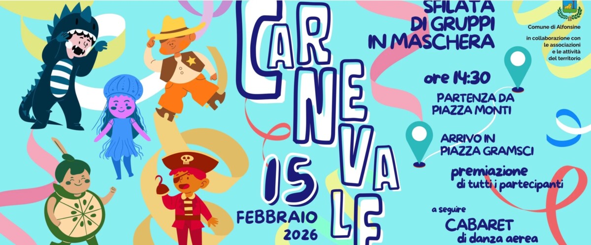 Domenica 15 febbraio si festeggia il Carnevale 2026 ad Alfonsine con sfilata di gruppi in maschera tra Piazza Monti e piazza Gramsci.