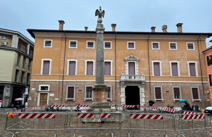 Dopo le scosse di terremoto del 13 gennaio, il Comune di Ravenna ha avviato controlli sui principali monumenti cittadini, in particolare su quelli con elementi strutturali posti in altezza. Le verifiche hanno riguardato le colonne di piazza del Popolo e piazza XX Settembre, più conosciuta come piazza dell’Aquila. Proprio l’alto monumento di quest’ultima è risultato poco stabile, e quindi recintato con evidenti transenne che occupano gran parte della piazza (circa 72mq).