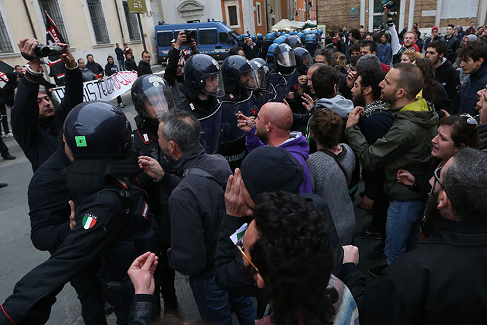 Erano una ventina, forse meno, i manifestanti di Forza Nuova scesi in piazza a Ravenna a una settimana dal 25 aprile per gridare il loro no all’immigrazione. La manifestazione del partito di estrema destra aveva caratterizzato il dibattito politico dell’ultima settimana a Ravenna con il sindaco Fabrizio Matteucci (e l’Anpi provinciale) che aveva invitato i ravennati a ignorare l’evento. In realtà, come ampiamente prevedibile, anche se non autorizzata ufficialmente, in piazza del Popolo è andata in scena una sorta di contromanifestazione, una protesta antifascista (a cui ha partecipato anche il deputato ravennate di Sel, Giovanni Paglia) sfociata in alcuni momenti di tensione, con le forze dell’ordine impegnate a tenere divise le due fazioni. Le manifestazioni sono poi finite senza episodi particolari da segnalare, anche probabilmente a causa della pioggia.