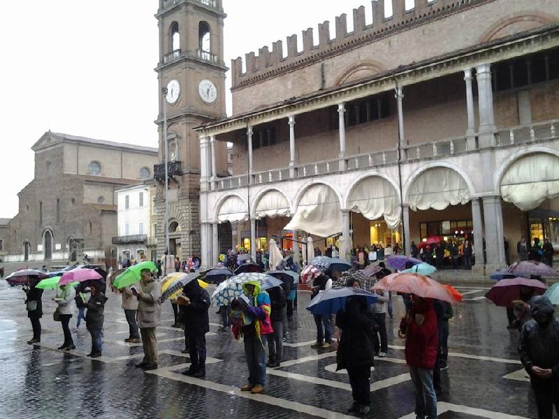 Manifestazione delle Sentinelle in piedi sotto la pioggia in piazza del Popolo a Faenza. Stavolta ci son voluti gli ombrelli per poter leggere in silenzio a difesa della ‘famiglia naturale’ basata sull’unione uomo-donna.