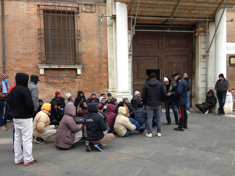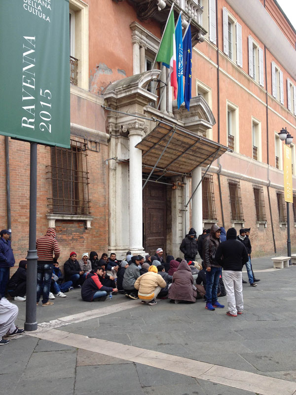 Circa cinquanta profughi pakistani sono accampati sotto la Prefettura di Ravenna per avere risposte. La scena in piazza del Popolo è surreale, accanto alle bancarelle che vendono chincaglierie natalizie questo silenzioso gruppo di persone si è seduto davanti al portone del prefetto e aspetta almeno un segno.