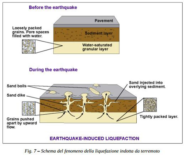 «In geologia – si legge da Wikipedia – la liquefazione delle sabbie è il comportamento dei suoli sabbiosi che, a causa di un aumento della pressione interstiziale, passano improvvisamente da uno stato solido ad uno fluido, o con la consistenza di un liquido pesante».