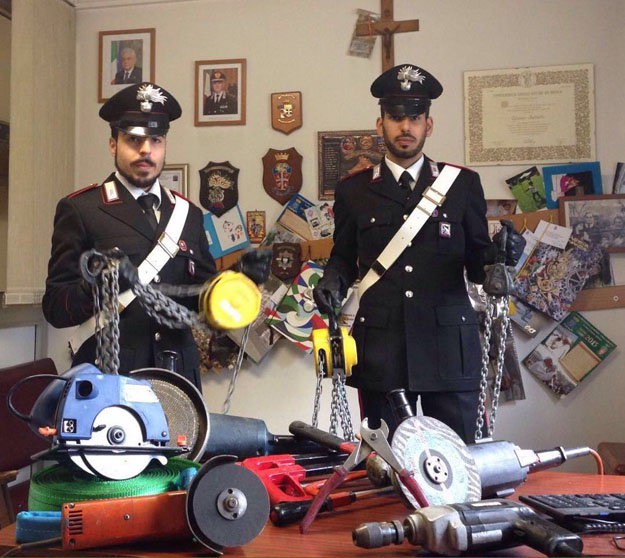 Ascoltati separatamente a proposito dell’attrezzatura in auto, uno ha dichiarato che si trattava di attrezzi per la sua attività di manovale e l’altro ha riferito che poco prima li avevano trovati abbandonati vicino un cassonetto dei rifuti, pertanto li avevano raccolti per verificarne il funzionamento. I militari hanno ipotizzato che fossero in giro per mettere a segno dei furti: tutto il materiale è stato sequestrato ed entrambi sono stati denunicati per “possesso di arnesi da scasso in concorso”.
