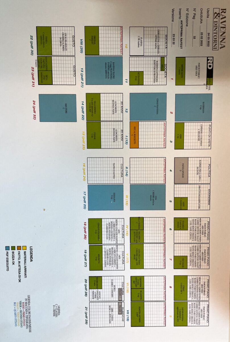 Nel corso della settimana, si continua a pieno ritmo con la produzione degli articoli, con l’importante aggiunta della stesura dei pezzi indirizzati alla testata web, (www.ravennaedintorni.it), che viene aggiornata quotidianamente, riuscendo così a raccogliere tutte le news e gli eventi della provincia. Giorno dopo giorno, le notizie destinate alla pubblicazione cartacea si accumulano, venendo via via spuntate dal timone fino al mercoledì, il giorno della “chiusura” del numero per la messa in stampa.