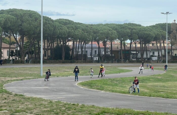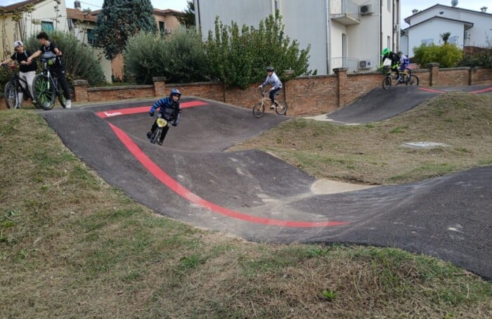 Nella zona a sud dell’ingresso di via Timavo, su una superficie di circa mille metri quadri, è stato realizzato invece un percorso di pump track (circuito di dossi, curve sopraelevate e discese appositamente progettato per essere percorso senza pedalare).