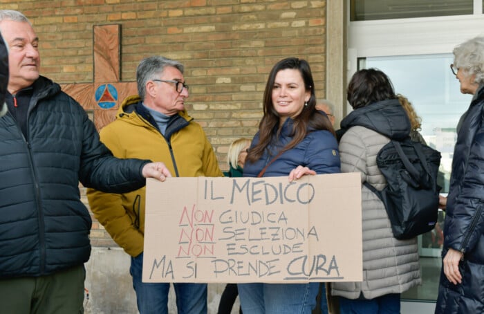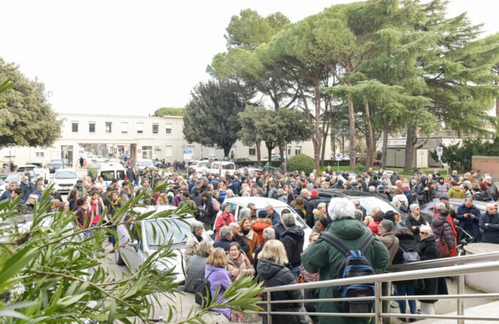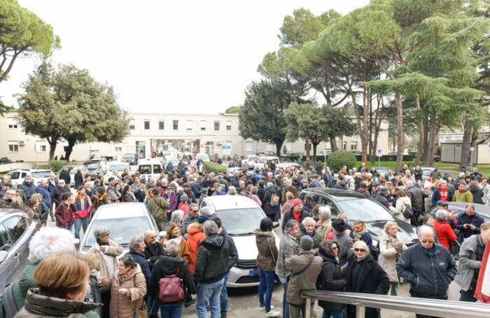Medici e infermieri, studenti di medicina, personale sanitario in pensione e sostenitori: in più di duecento persone si sono radunate oggi (16 febbraio) davanti all’ingresso di via Missiroli dell’ospedale di Ravenna per il flash-mob organizzato dagli operatori del Santa Maria delle Croci, in particolare Petia Di Lorenzo (coordinatrice infermieristica), Marco Montanari (oncologo) e Federica Giannotti (cardiologa) a sostegno dei sei colleghi del reparto di Malattie infettive indagati per il reato di falso ideologico continuato in concorso, per la vicenda dei cosiddetti certificati “anti-rimpatrio”, che avrebbero favorito la permanenza sul territorio di cittadini stranieri irregolari giudicandoli inidonei all’ingresso nei centri per il rimpatrio o a viaggi aerei.