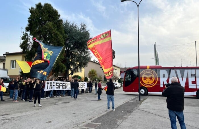 A meno di 24 ore dalla partita tra Livorno e Ravenna (calcio d’inizio domenica 16 novembre alle 14.30), match valido per la 14esima giornata del girone B di Serie C, un centinaio di tifosi ha salutato la squadra in partenza dal Benelli. Come noto il Ravenna non avrà il supporto della sua gente per affrontare la difficile trasferta dell’Armando Picchi per via di una decisione presa per questioni di ordine pubblico. La scelta è stata contestata dai tifosi con un chiaro striscione: “Trasferte Libere”. Sia la società (attraverso un comunicato consultabile a questo link), che mister Marchionni, hanno alzato la voce in merito: «A me dispiace perché così si sta rovinando il calcio – ha commentato l’allenatore in conferenza stampa -. Non so per quale motivo sia stata presa una decisione simile. Ravenna è una tifoseria calma, passionale che tiene alla squadra e che ha portato rispetto ovunque. Lo sport senza tifosi è brutto e così si va a rovinare una partita che avrebbe visto tanti nostri tifosi al seguito. La squadra c’è rimasta male, anche perché abbiamo bisogno dei nostri tifosi».