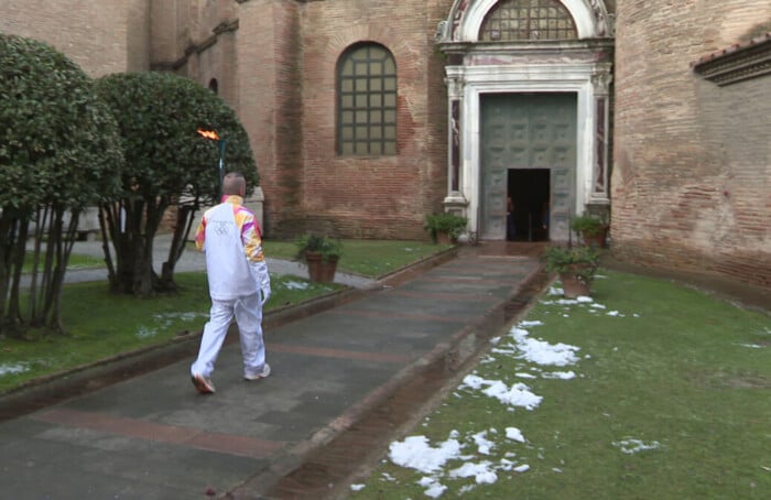 La fiamma ha toccato alcuni dei punti simbolo della città come il Mausoleo del Teodorico, la Rocca Brancaleone, Porta Serrata (vicino alla quale si sono radunate classi della scuola elementare) e il Teatro Alighieri, prima di entrare nella transennata Piazza del Popolo. Circa 500 persone hanno accolto la fiamma olimpica, preceduta da una carovana di polizia e sponsor come Coca Cola e Eni. Tra le colonne è stato posto il braciere, acceso dal fuoco dei cinque cerchi e reso ancora più suggestivo dai tamburi al suo fianco. Il breve discorso del sindaco Barattoni è stato accompagnato dai cori e i fischi di circa 30 pro Pal, che contestano la partecipazione di Israele alle Olimpiadi: «È con grande orgoglio che Ravenna vuole essere parte delle Olimpiadi – ha affermato il primo cittadino -. Una grande emozione che tanti cittadini siano scesi per le strade ad accompagnare questo evento storicamente portatore di pace». Quest’ultima parola, in quel contesto, non è piaciuta ai manifestanti che si sono lasciati andare al grido di «vergogna».