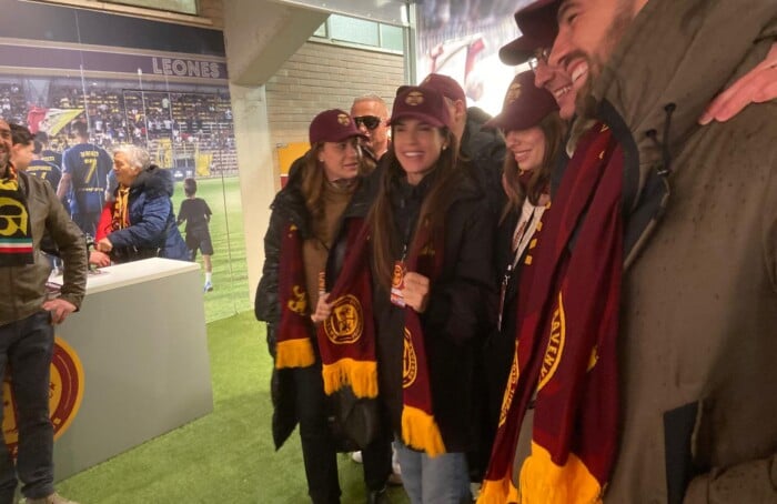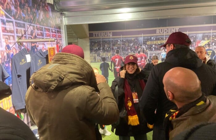 «Come mai Ravenna? Perché sono molto amica del suo presidente (Ignazio Cipriani, ndr)», ci dice la celebre showgirl quando la incontriamo brevemente nello store all’ingresso della tribuna Corvetta, con addosso cappellino e sciarpa giallorossa. «Speriamo in un futuro in serie B o serie A, incrociamo le dita».